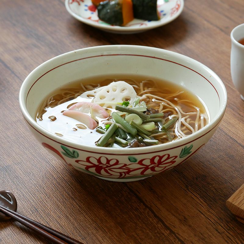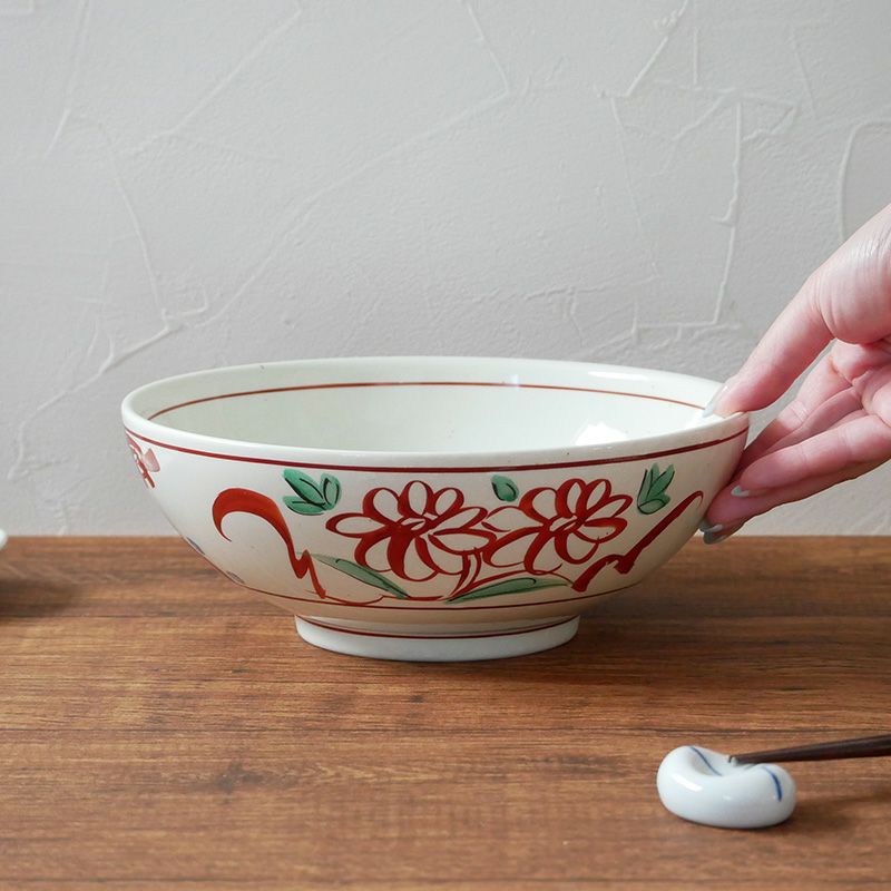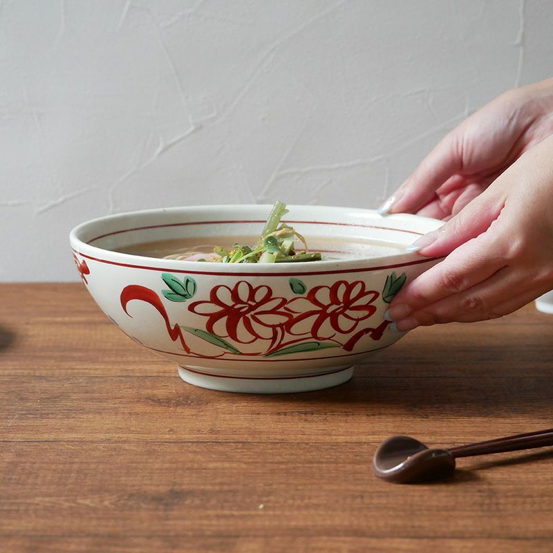 手描きの絵柄が施されたあたたかみのある麺鉢。 約21cmの麺鉢は和食やアジアン料理に馴染んでくれるサイズです。 普段使いはもちろん、おもてなしにもオススメ。 テーブルをグッと引き締め、どんなお料理も引き立ててくれます。