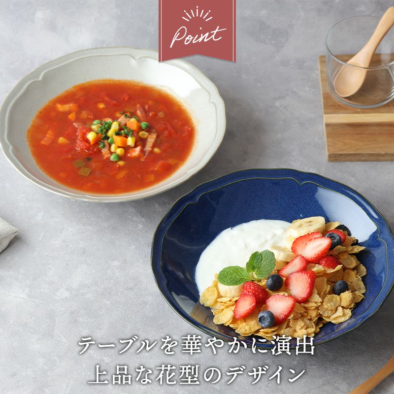 花型のデザインが上品な雰囲気を演出してくれるKARINシリーズ。 普段の料理でもワンランク格上げしてくれるような器です。 スープ以外にもサラダボウル、パスタボウル、シリアルボウルなど多用途にお使いいただけます。 複数枚そろえておくと重宝するサイズのお皿です。