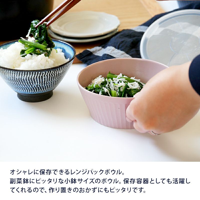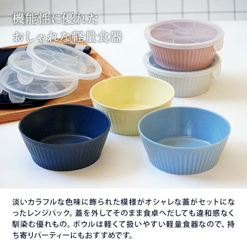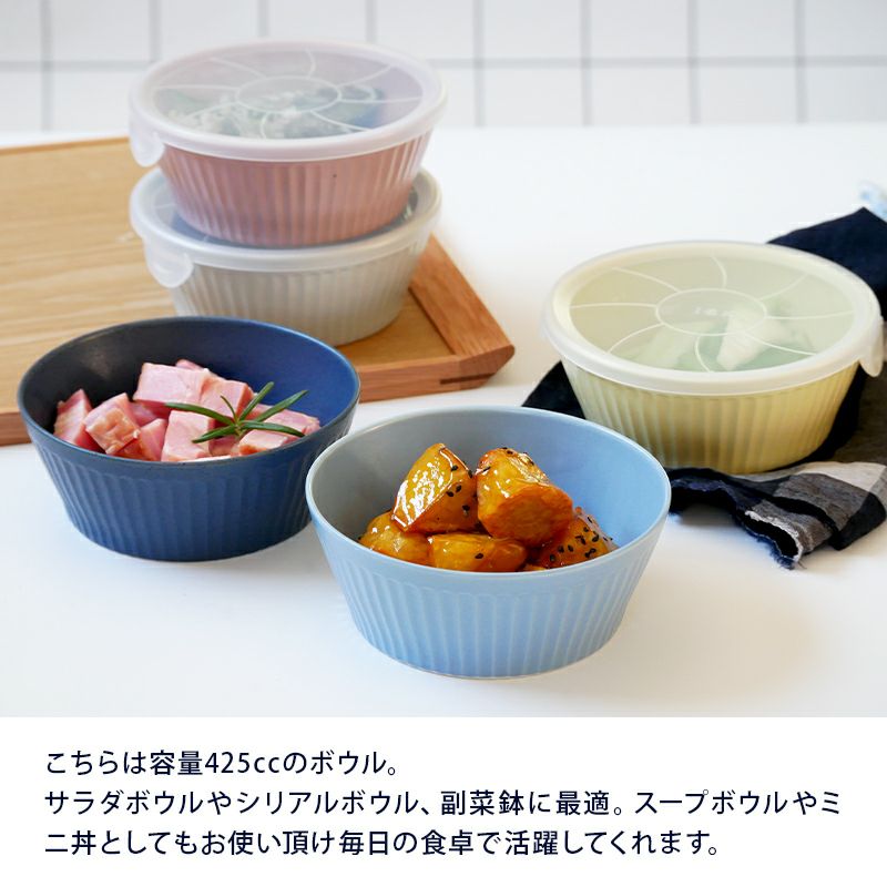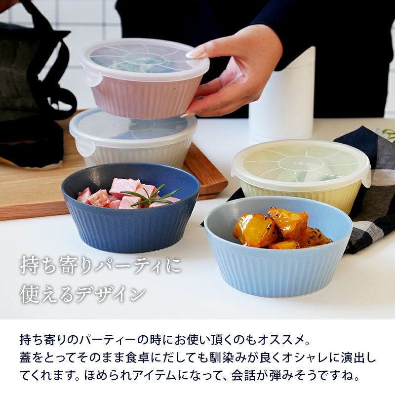 蓋を外してそのまま食卓に出せるおしゃれな保存容器。 食器へ入れ替える手間が省けて、忙しい時にも便利ですよ。 本体は磁器製なので、食品のにおい移りや色移りがなく、すっきり洗えるのもうれしいポイント。 ボウルは軽くて扱いやすい軽量食器なので、持ち寄りパーティーにもおすすめです。 こちらは中鉢サイズで、サラダボウル、副菜鉢、残ったご飯の保存にぴったり。 機能性とデザイン性を兼ね備えた保存容器なので、活用の場が広がります。