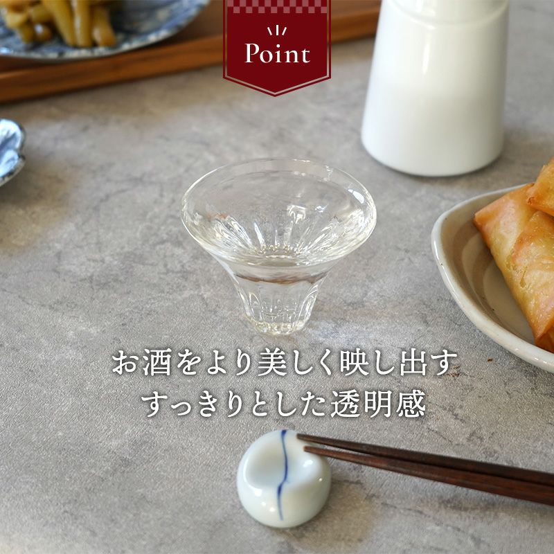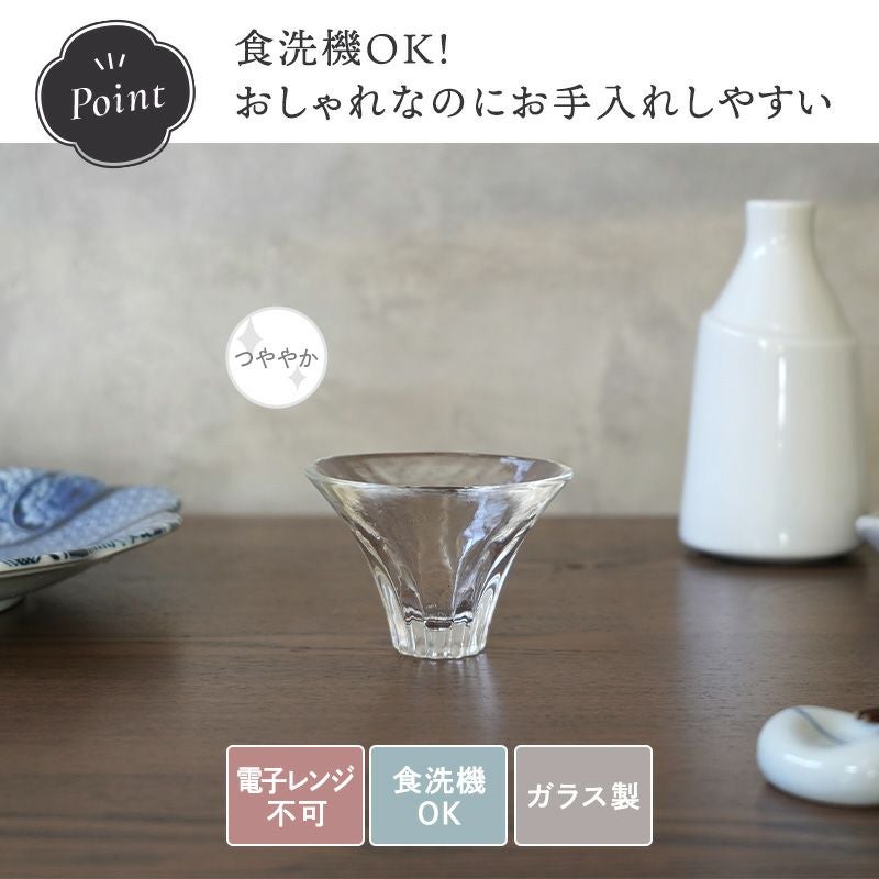 普段の晩酌のお供にぴったりなサイズのガラス製ぐい呑です。 小ぶりでありながら持ちやすいデザイン。 普段用にもおもてなし用にもぴったりなので複数揃えることもおすすめです。 日本酒はもちろん、小鉢としておかずを入れるのにもお使いいただけますよ。