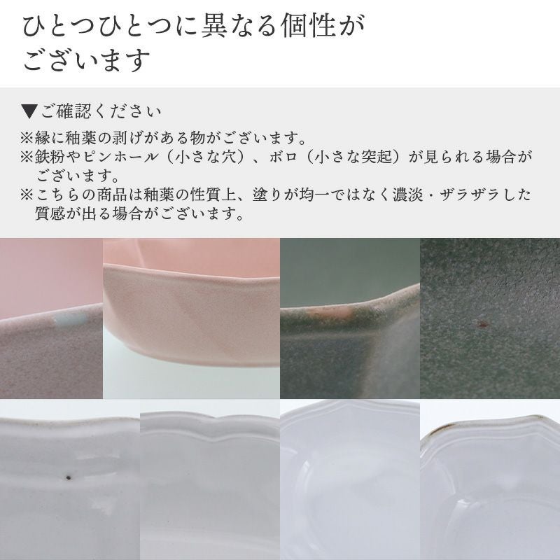 | 注意事項 | ※サイズは全て外寸になります。 ※サイズ・重さなどは商品により誤差があります。 ご注意 ※縁に釉薬の剥げ、鉄粉やピンホール、ボロが見られる場合がございます。 ※ピンク・ブルー・グリーンの裏印の周りに釉薬の垂れ・ムラがある場合がございます。(ホワイト・ブラックは裏印なし) ※釉薬の性質上、濃淡・ザラザラした質感が出る場合がございます。 ※黒土ブラックは食材の油分や皮脂が染み込みやすくなっております。 ※画像に含まれる小物は使用イメージのために使用しています。 |