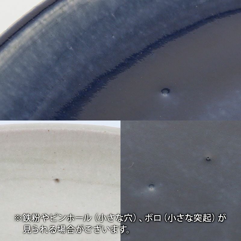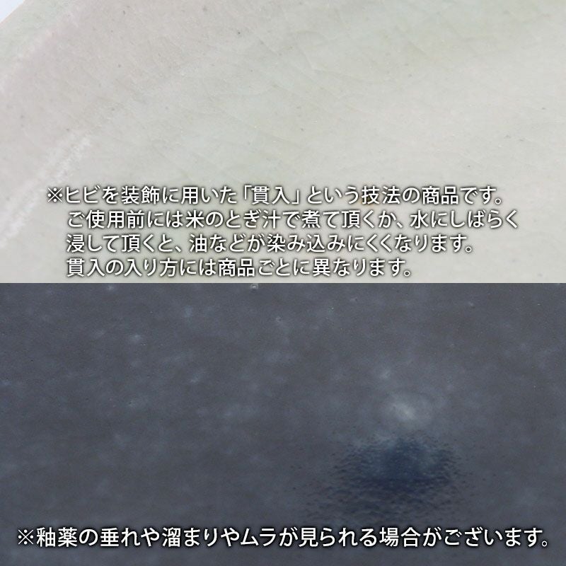 | 注意事項 | ※サイズは全て外寸になります。※サイズ・重さなどは商品により誤差があります。 ご注意 ※鉄粉やピンホール(小さな穴)、ボロ(小さな突起)が見られる場合がございます。 ※釉薬の垂れや溜まりやムラが見られる場合がございます。 ※ヒビを装飾に用いた「貫入」という技法の商品です。ご使用前には米のとぎ汁で煮て頂くか、水にしばらく浸して頂くと、油などが染み込みにくくなります。貫入の入り方には商品ごとに異なります。 ※お客様のお使いのモニター設定、お部屋の照明等により実際の商品と色味が異なって見える場合がございます。 ※画像に含まれる小物は使用イメージのために使用しています。 ※不明な点がございましたら、お気軽にお問い合わせ下さい。 |