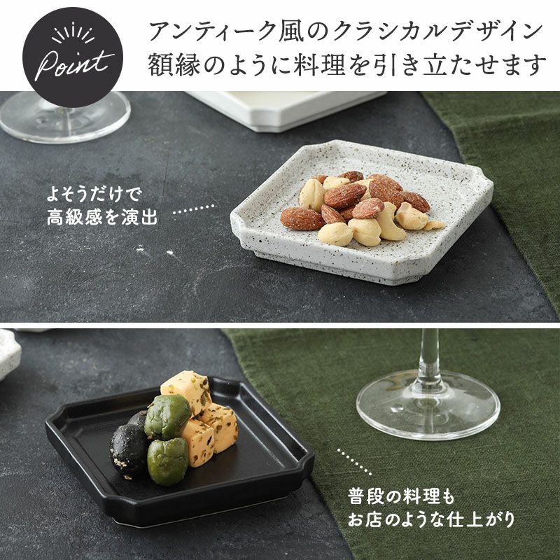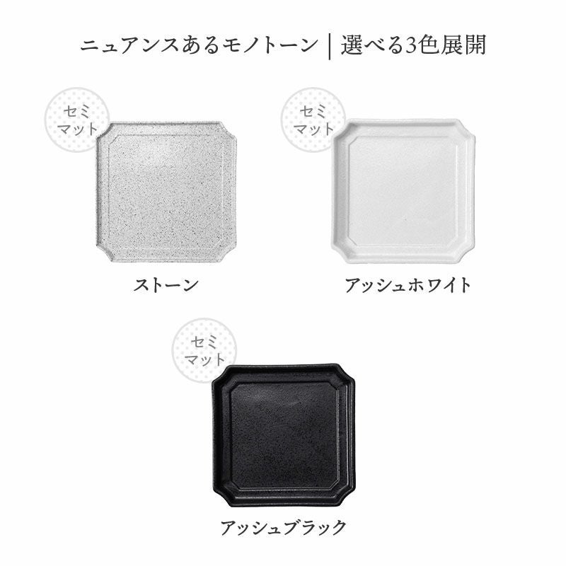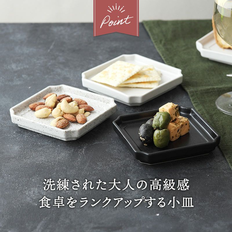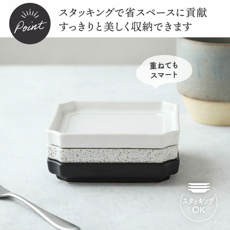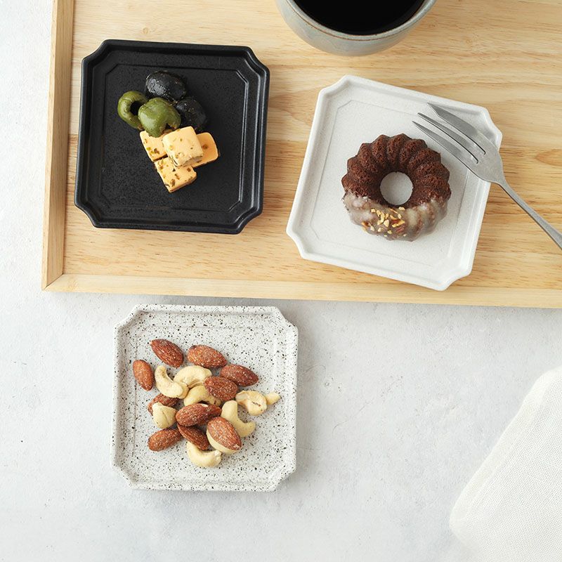 シンプルでありながら、洗練されたデザインがおしゃれなプレート。 カラーはストーン柄・ホワイト・ブラックの3種類でどんな料理も引き立て、上品なテーブルを演出します。 こちらは小皿サイズでフルーツ皿、菓子皿、漬物皿、薬味皿におすすめ。