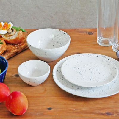 無駄を省いたシンプルな形状のボウル。 釉薬を吹き付けた模様は天然石を思わせるようでナチュラルな食卓にはもちろん、モノトーンカラーを生かしてモダンでおしゃれな雰囲気にも演出できます。 同じシリーズのサイズ違いのボウルやプレートで揃えておくと統一感のあるすっきりとした食卓コーディネートを楽しめますよ。 こちらはボウルMサイズ。サラダ・シリアル・スープボウル・ご飯茶碗としてお使いいただける小鉢です。 朝昼晩と出番の多い器になりそうですね。