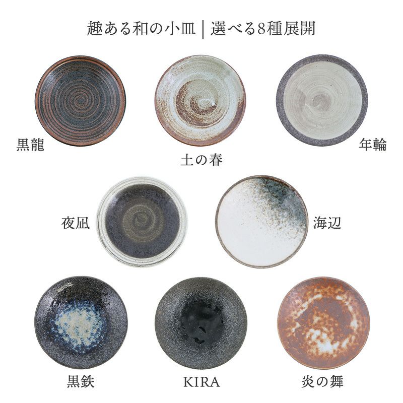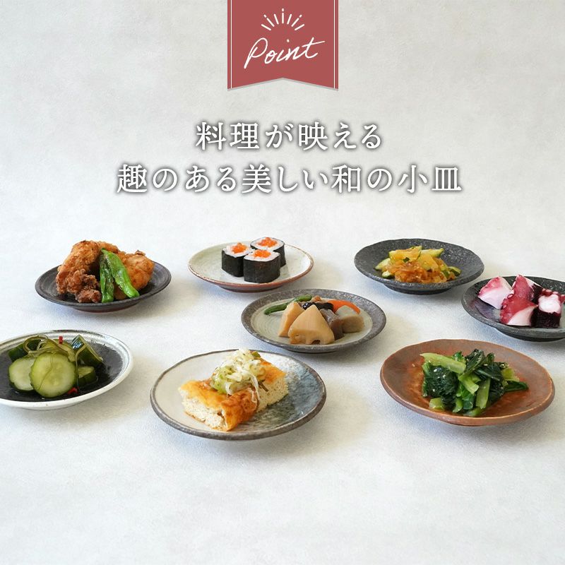 組み合わせて楽しめる、趣のある美しい和の小皿。 様々な柄、色が施された小皿は醤油皿、薬味皿、珍味皿などに使えるサイズ。 他にもカットフルーツや、菓子皿など、デザートプレートにもおすすめ。 お料理を少しずつ盛りつけて、おばんざいのようにご使用いただくのもぴったりのサイズです。
