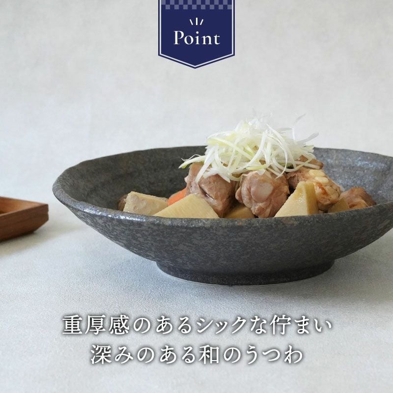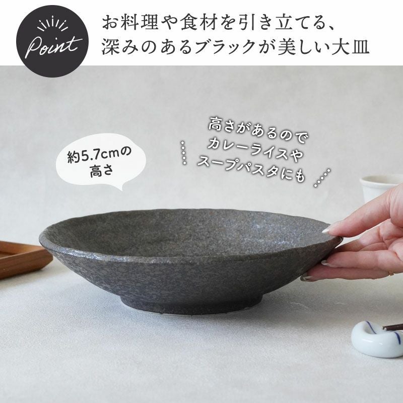 シックで落ち着いた雰囲気の黒い盛り皿。 大皿はディナープレートとして、メインディッシュに最適です。 メイン料理だけでなく、パスタ皿、おかずの盛り皿、大きいお皿はワンプレート、ランチプレートに、朝昼晩使える食器です。 一枚で色々な用途に使える、活躍する一点です。