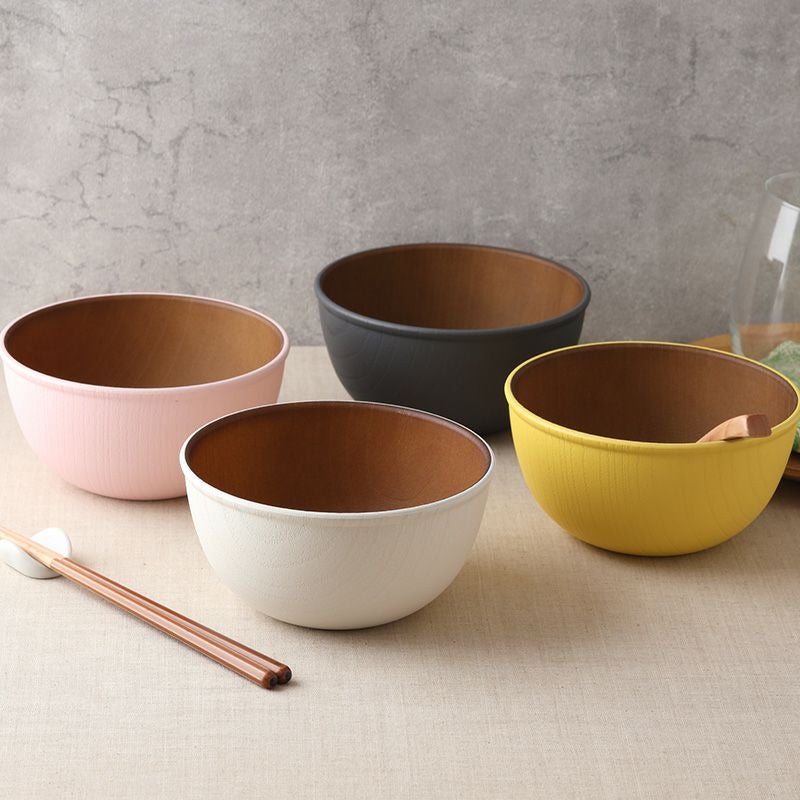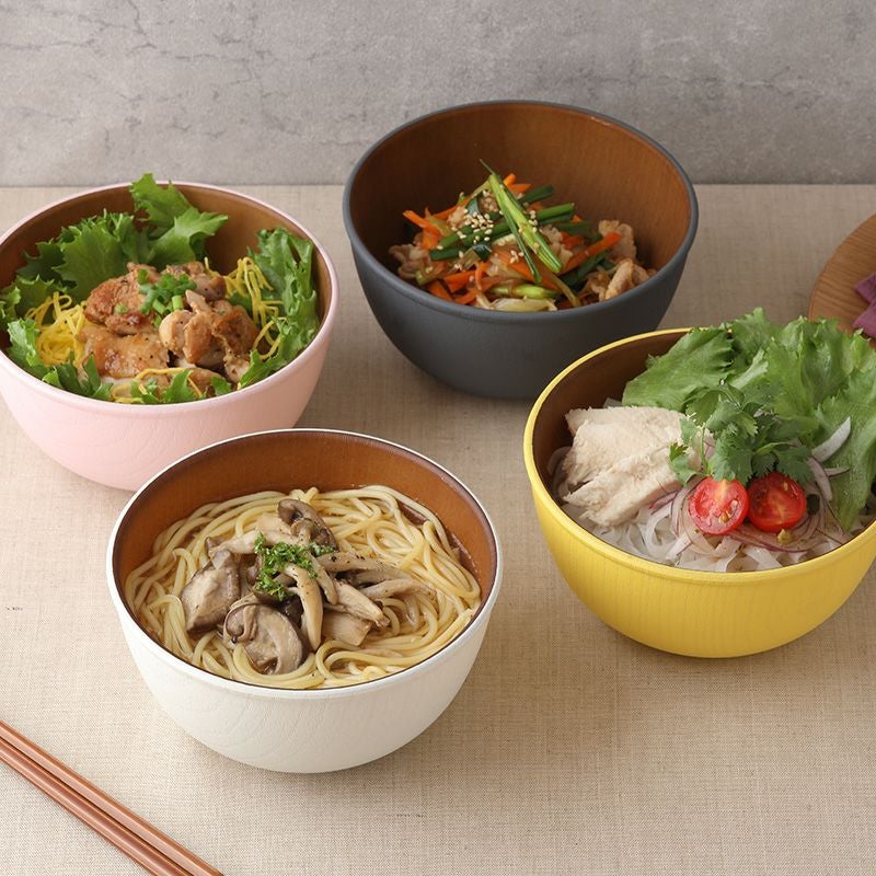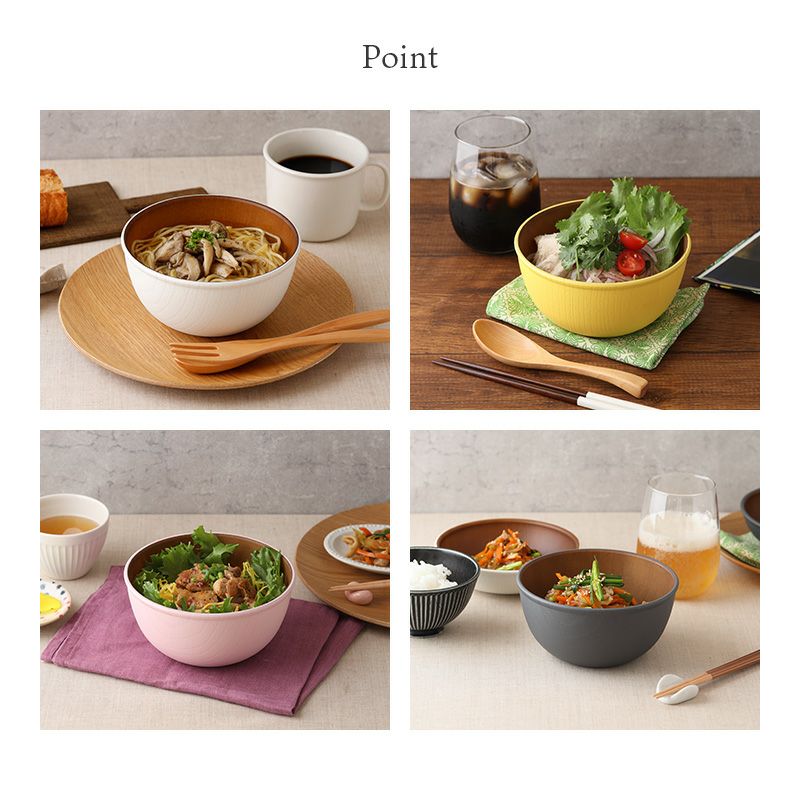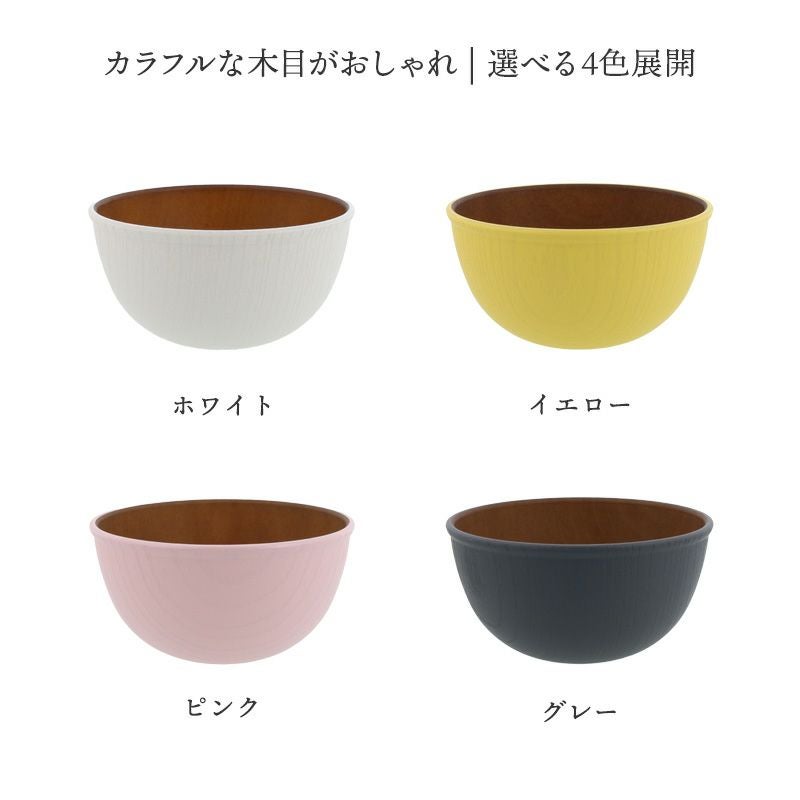 木目調のカラフルなスープボウル。 樹脂製ながら木製の雰囲気で、食卓をナチュラルに演出してくれます。 こちらは、副菜鉢、ヨーグルトボウル、サラダボウル、フルーツボウル、取り鉢などにぴったり。 普段使いだけでなく子供用食器として、またピクニックやキャンプなどのアウトドア食器としても最適です。
