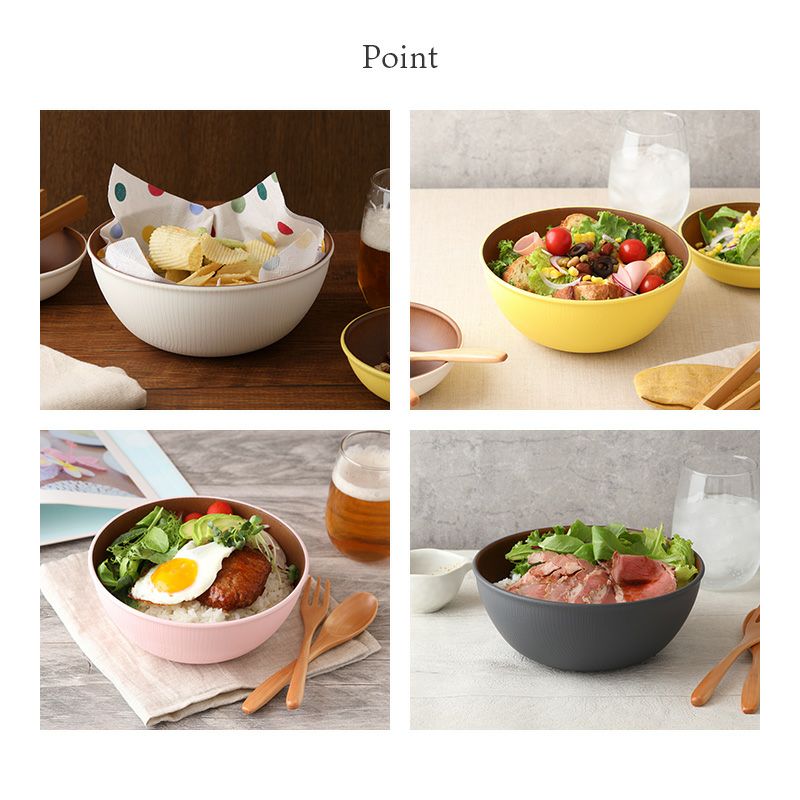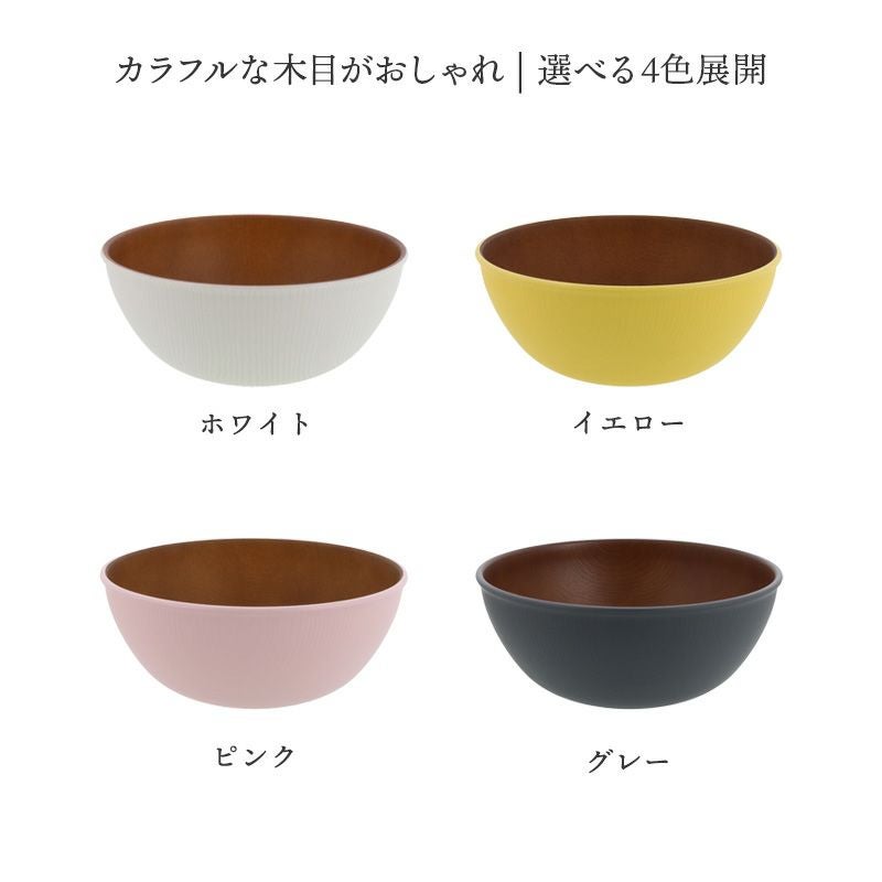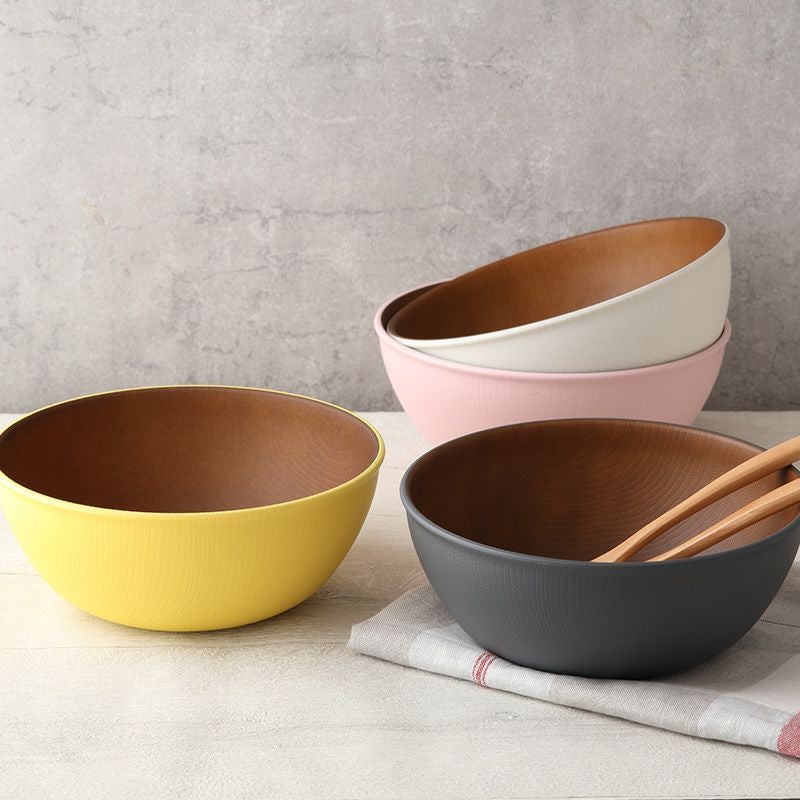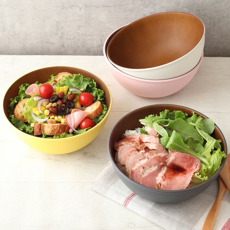 木目調のカラフルなサラダボウル。 樹脂製ながら木製の雰囲気で、食卓をナチュラルに演出してくれます。 煮物やサラダなどをまとめる大鉢、おかずの盛り鉢、麺鉢などにおすすめ。 普段使いだけでなく、ピクニックやキャンプなどのアウトドア食器としても最適です。