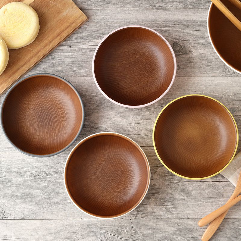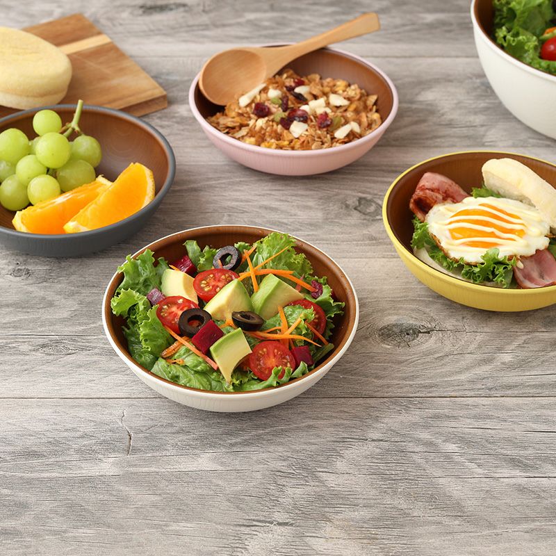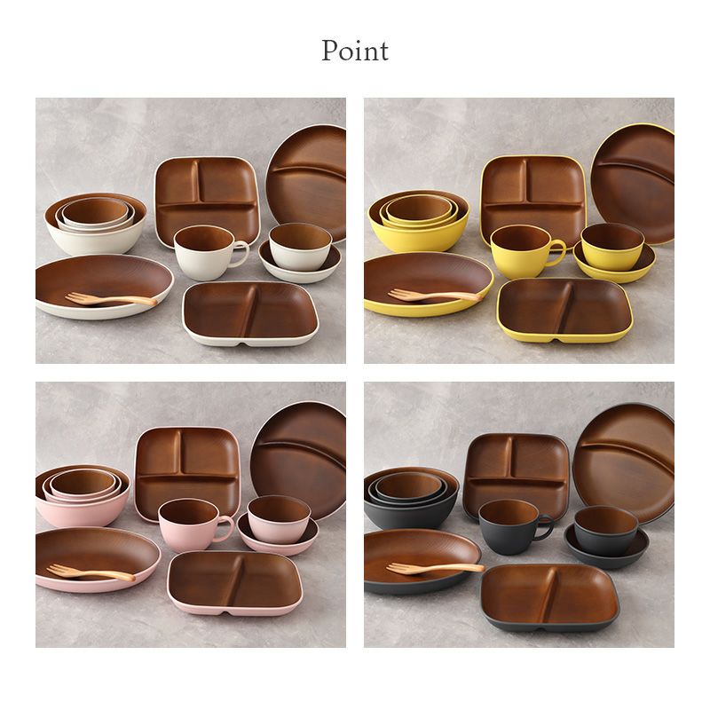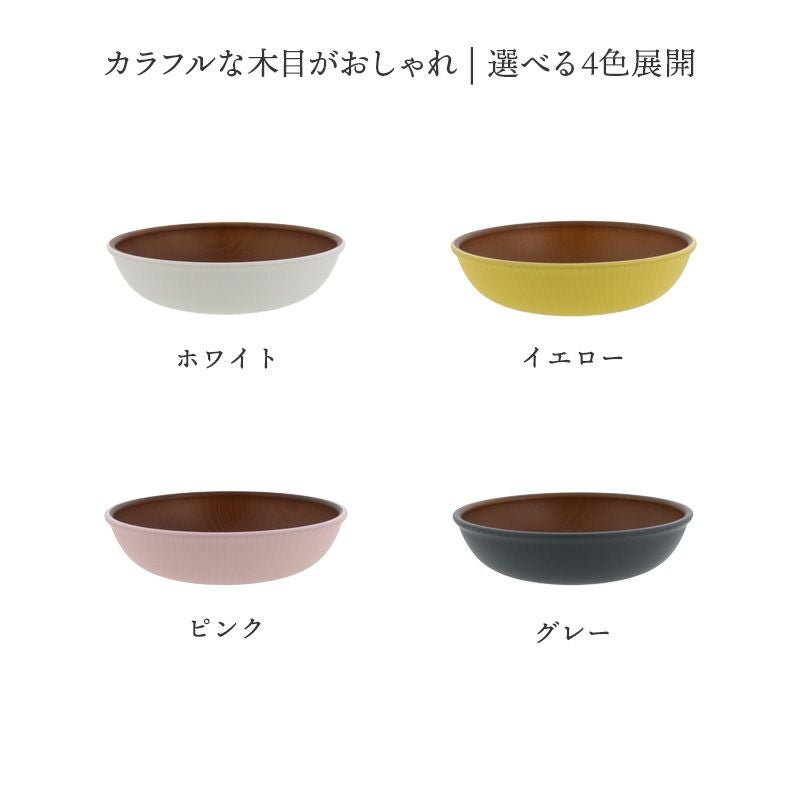 木目調のカラフルなプレート。 樹脂製ながら木製の雰囲気で、食卓をナチュラルに演出してくれます。 こちらは使いやすい中皿サイズで、副菜皿、取り皿など、様々な用途に大活躍。 普段使いだけでなく子供用食器として、またピクニックやキャンプなどのアウトドア食器としても最適です。