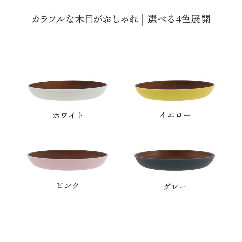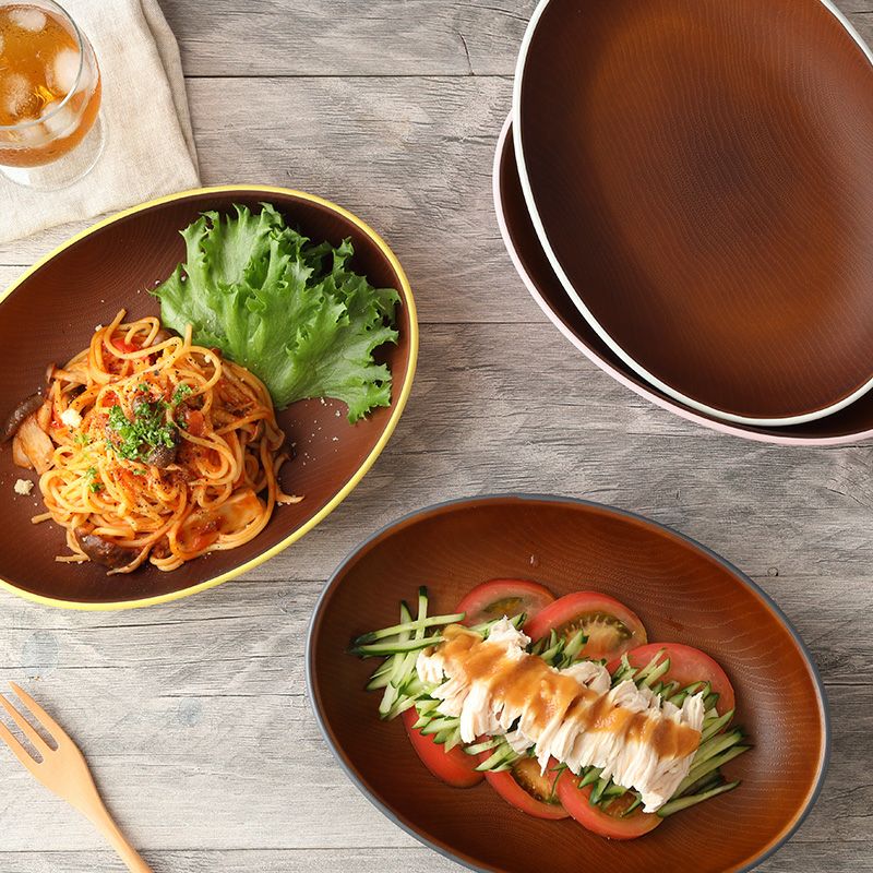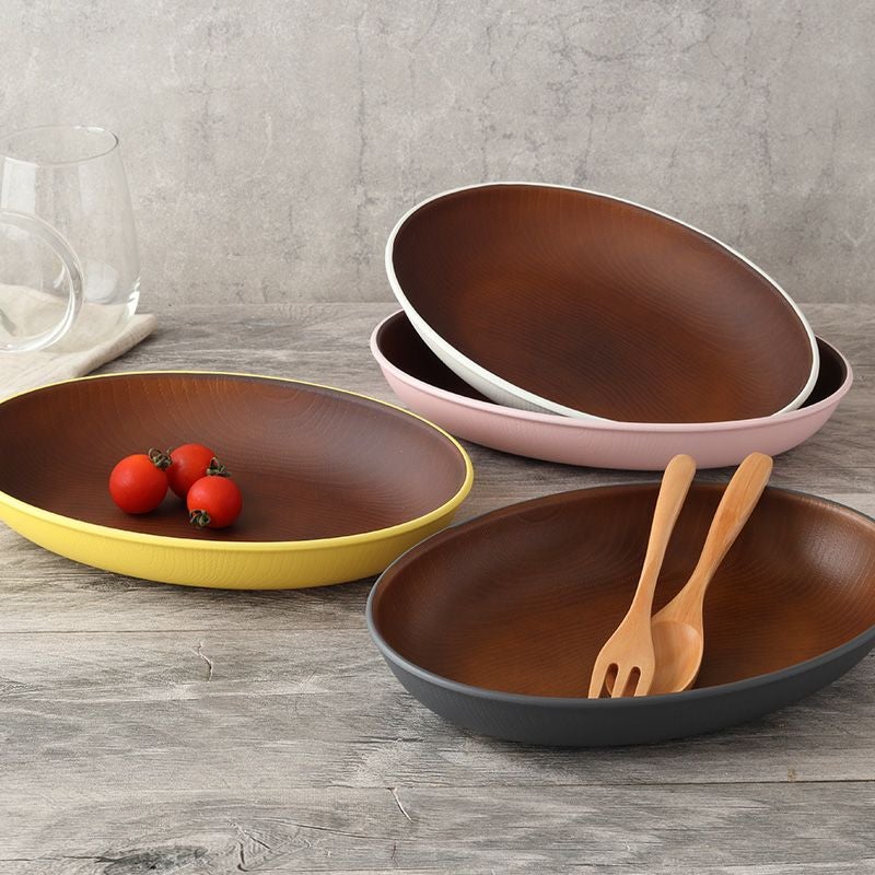 木目調のカラフルなオーバルプレート。 樹脂製ながら木製の雰囲気で、食卓をナチュラルに演出してくれます。 程よい大きさでオムライス、カレー皿、パスタ皿、サラダ皿、メインプレートなどにおすすめ。 普段使いだけでなく、ピクニックやキャンプなどのアウトドア食器としても最適です。