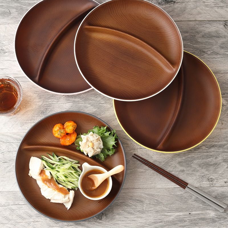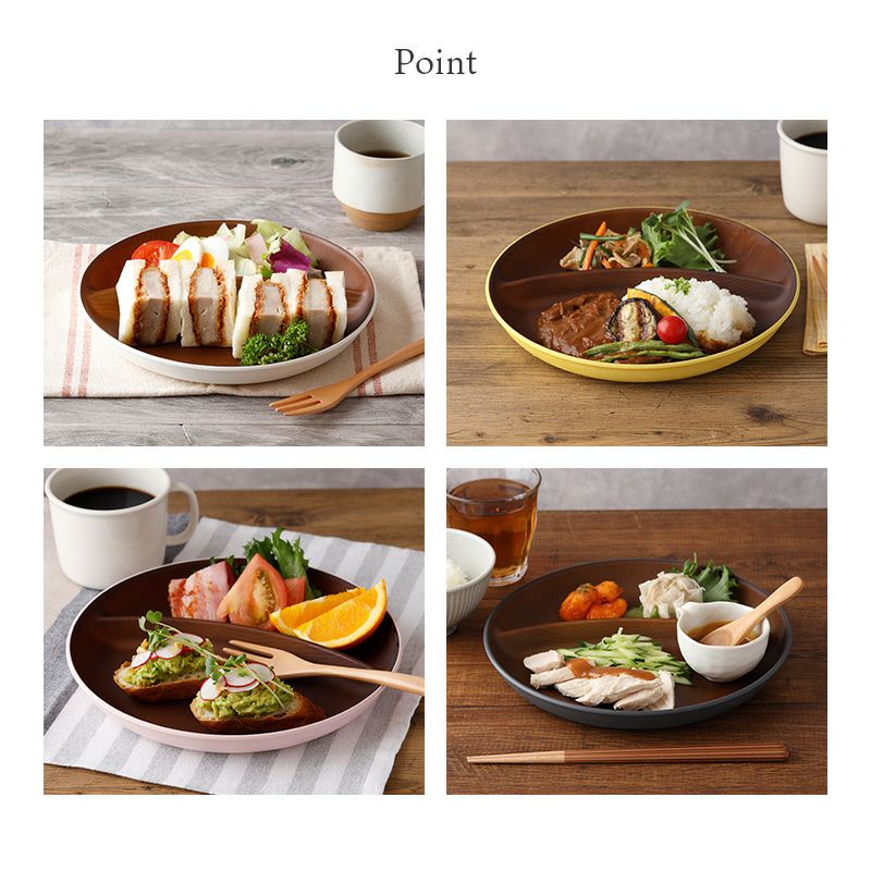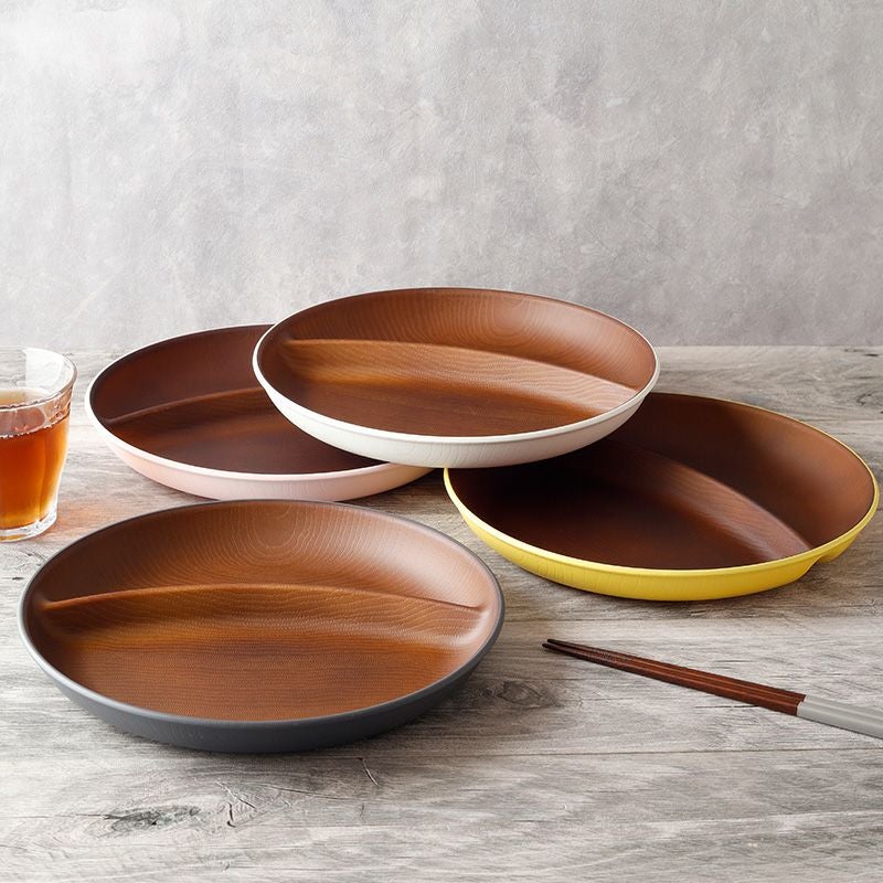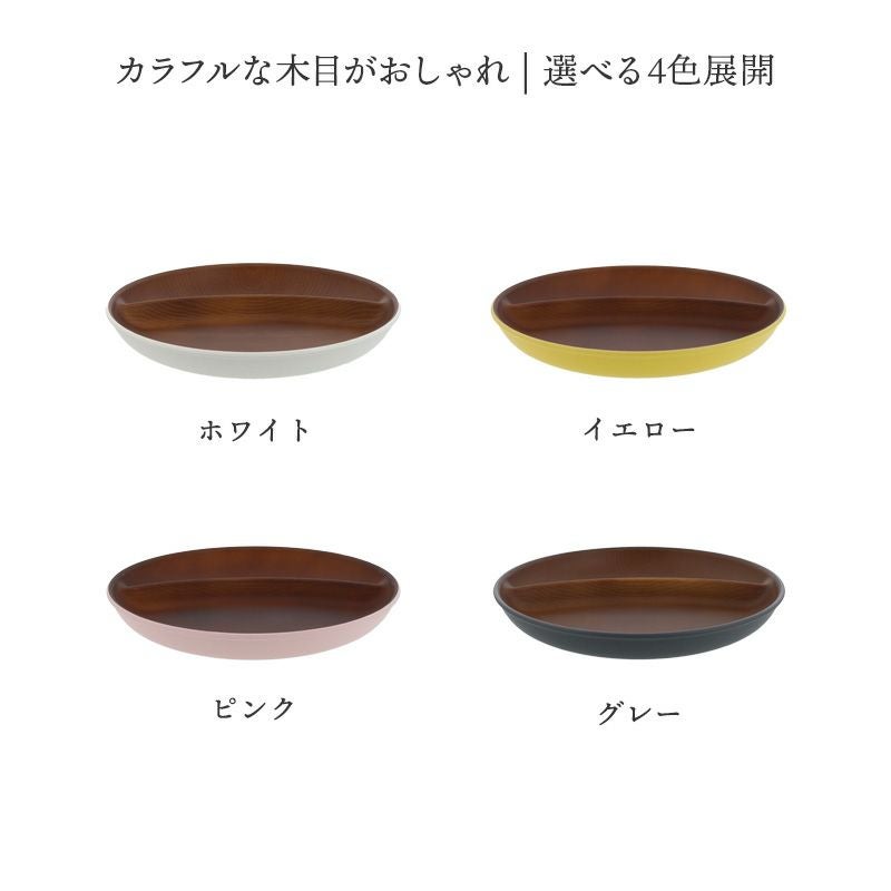 木目調のカラフルな仕切りプレート。 樹脂製ながら木製の雰囲気で、食卓をナチュラルに演出してくれます。 朝食プレート、ランチプレート、こども食器などにおすすめ。 普段使いだけでなく、ピクニックやキャンプなどのアウトドア食器としても最適です。