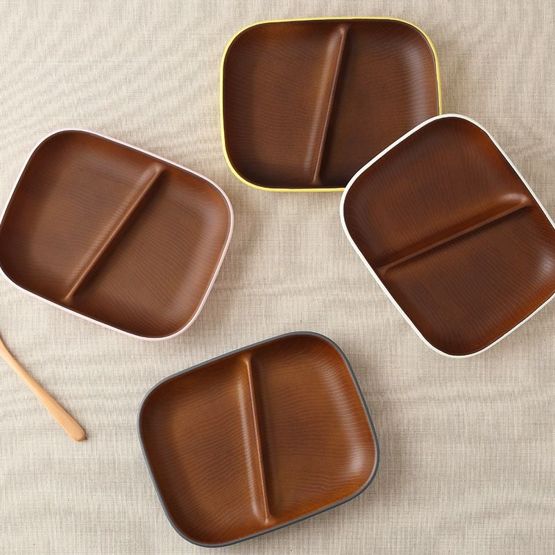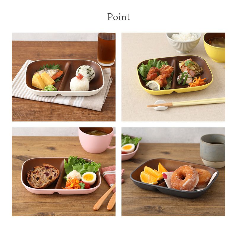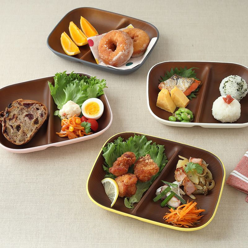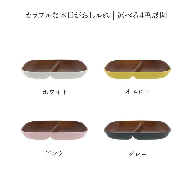 木目調のカラフルな仕切りプレート。 樹脂製ながら木製の雰囲気で、食卓をナチュラルに演出してくれます。 朝食プレート、ランチプレート、こども食器などにおすすめ。 普段使いだけでなく、ピクニックやキャンプなどのアウトドア食器としても最適です。