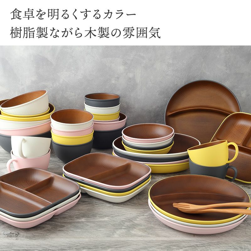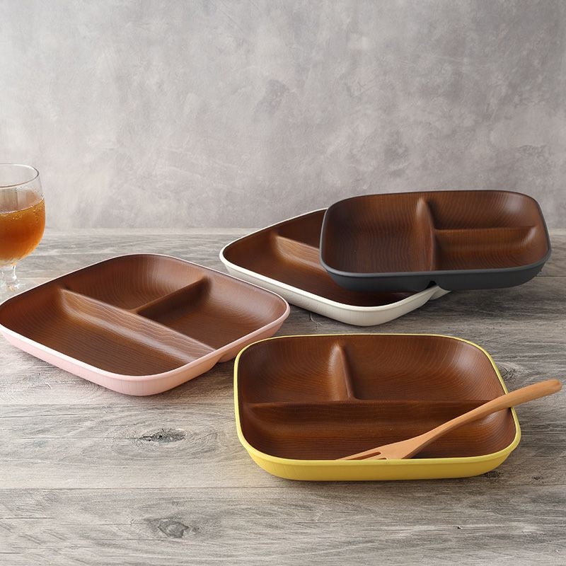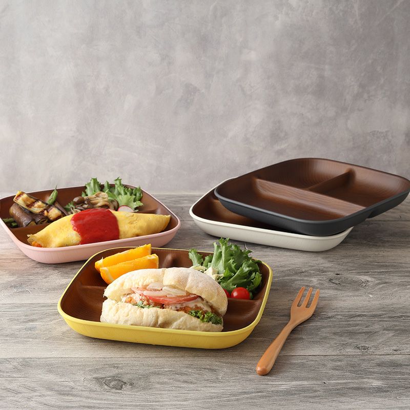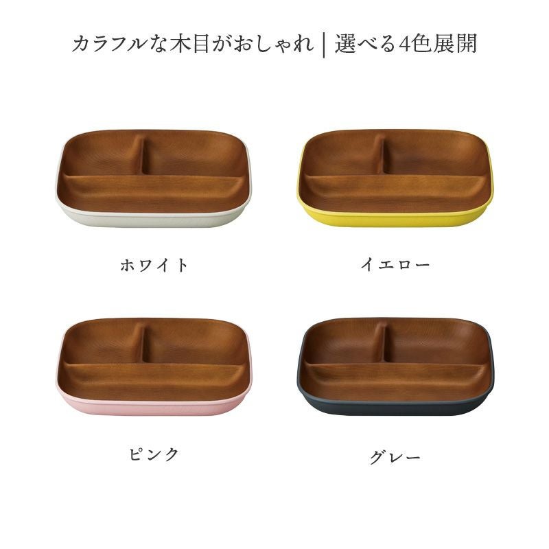 木目調のカラフルな仕切りプレート。 樹脂製ながら木製の雰囲気で、食卓をナチュラルに演出してくれます。 朝食プレート、ランチプレート、こども食器などにおすすめ。 普段使いだけでなく、ピクニックやキャンプなどのアウトドア食器としても最適です。