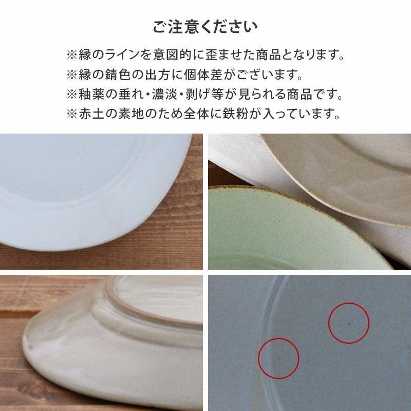 | 注意事項 | ※サイズは全て外寸になります。 ご注意 ※縁のラインを意図的に歪ませた商品となります。 ※入荷毎に色味が多少異なります。 ※釉薬の垂れ・濃淡・剥げ等が見られる商品です。 ※赤土の素地のため全体に鉄粉が入っています。 ※縁の錆色の出方に個体差がございます。 ※裏印部分に色飛びが見られる場合がございます。 ※一つずつ色や形状に個体差がある商品ですので、予めご了承の上ご購入くださいませ。均一性を求められるお客様はご注意ください。 ※お客様のお使いのモニター設定、お部屋の照明等により実際の商品と色味が異なって見える場合がございます。 ※不明な点がございましたら、お気軽にお問い合わせ下さい。 |