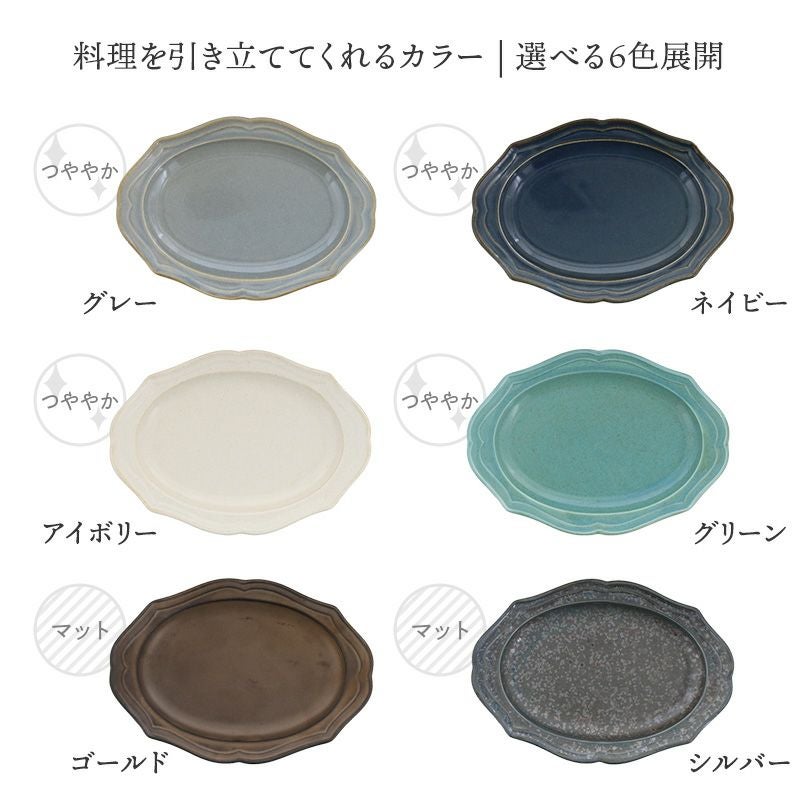 リム部分がデザインされた楕円型のお皿です。 おしゃれな形状で、食材を乗せただけで映える器です。 マットな質感はテーブルを洗練された印象にまとめ、 サラダやデザートなど、盛り付けたお料理を引き立てます。 グレー・ネイビー・アイボリー・グリーンは均一な色ではなく、 あえてムラを出したことにより 一つずつ表情が異なる良さを愉しんでいただく器です。 ゴールドとシルバーはまるで金属のようなカラーで、何を乗せてもシャビーシックな雰囲気になります。 特殊な釉薬なため、油分が染み込みやすいというデメリットがありますが、見た目・質感を重視して使用したい、という方にはおススメです。 (必ず下記のご注意をお読みの上、ご購入をお願いいたします。) こちらのお皿は横幅が17cm程度ですが、盛り付ける部分は13.5cm程のためサイズ感的には小皿位になります。 前菜皿やミニケーキ、フルーツ、小さめのパン皿として活躍するサイズです。