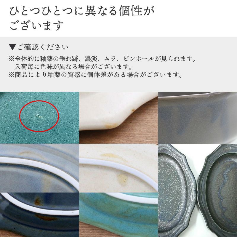 | 注意事項 | ※サイズは全て外寸になります。 ご注意 ※釉薬の垂れ跡、濃淡、ムラ、ピンホールが見られます。 入荷毎に色味が異なる場合がございます。 ※シルバーは全体に斑点が見られます。 ※シルバー・ゴールドは食材の油分や皮脂が染み込みやすくなっております。そのため手の脂の跡もつきやすいためご了承いただける方のみご購入をお願いいたします。 ※裏印部分に色飛びが見られる場合がございます。 ※商品により釉薬の質感に個体差がある場合がございます。 |