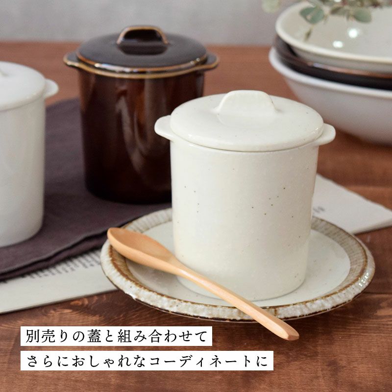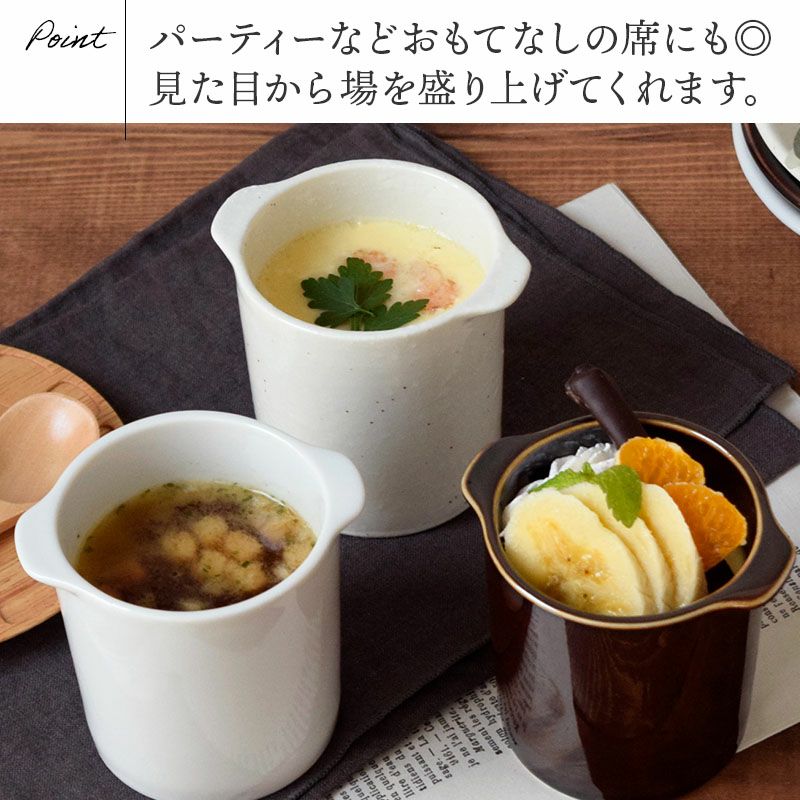 こちらの商品は、『蓋なし』です。 寸胴型のお鍋が小さくなったような形の耳付きココット。 こちらはメーカーに依頼して1から作成したEASTtableオリジナル商品です。 和洋問わず使えるデザインで、思わず自慢したくなるような他にはあまりない茶碗蒸し碗。 茶碗蒸し以外にも、スープカップやデザートカップなど、たくさんの使い方を楽しんでいただけます。 電子レンジ、食洗機、オーブン使用OK。機能性も抜群で、気軽にどんどん使えるようになっています。 EASTtableの想いがつまった蓋付きココット。 小鉢、スープ、デザートなど、ぜひ色々使ってみてください。