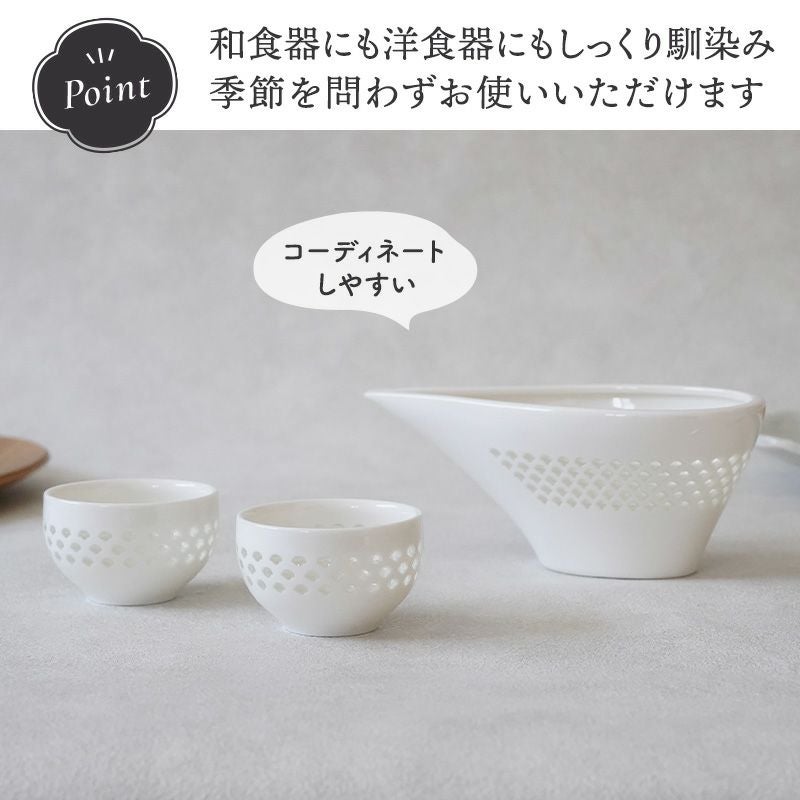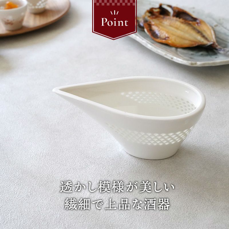 美しく上品な透かし彫りを施した酒器。 幅広い年代の方に使っていただけるデザイン。 和食・洋食どちらのテーブルにもしっくり馴染んでくれます。 普段使いからおもてなしまで幅広いシーンで活躍する上品な雰囲気の酒器です。