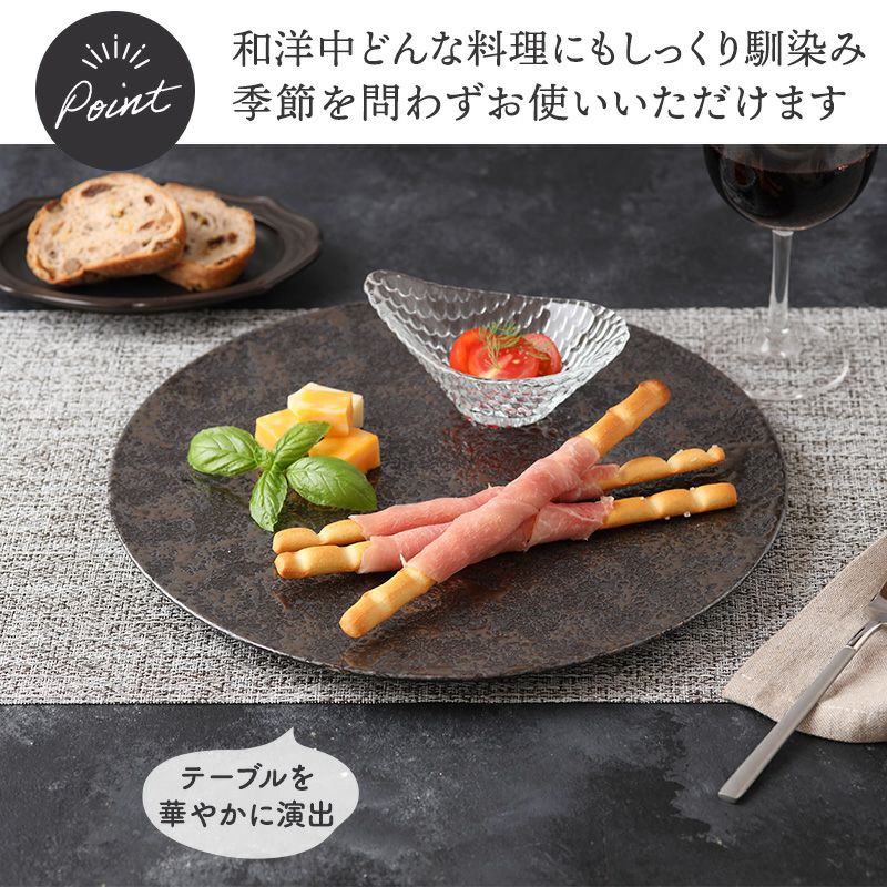 上品でおしゃれな雰囲気のプレートです。 こちらは大皿サイズで、ディナープレートとして、メインディッシュに最適。 メイン料理だけでなく、パスタ皿、おかずの盛り皿、ワンプレート、ランチプレートに、朝昼晩使える食器です。 全体に見られる微妙なでこぼこに独特の風合いがあり、シンプルな料理もさりげなく華やかに見せてくれるので、 パーティーやおもてなし料理も素敵に演出してくれます。