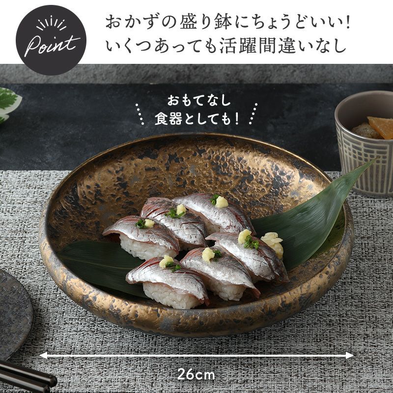 高級感あふれる和の盛り鉢。 こちらは大鉢サイズで、おかずの盛り鉢、サラダボウルなど、多用途に使えます。 深さがあるので汁物や汁気のある料理もOK。 全体に見られる微妙なでこぼこに独特の風合いがあり、シンプルな料理もさりげなく華やかに見せてくれるので、 パーティーやおもてなし料理も素敵に演出してくれます。