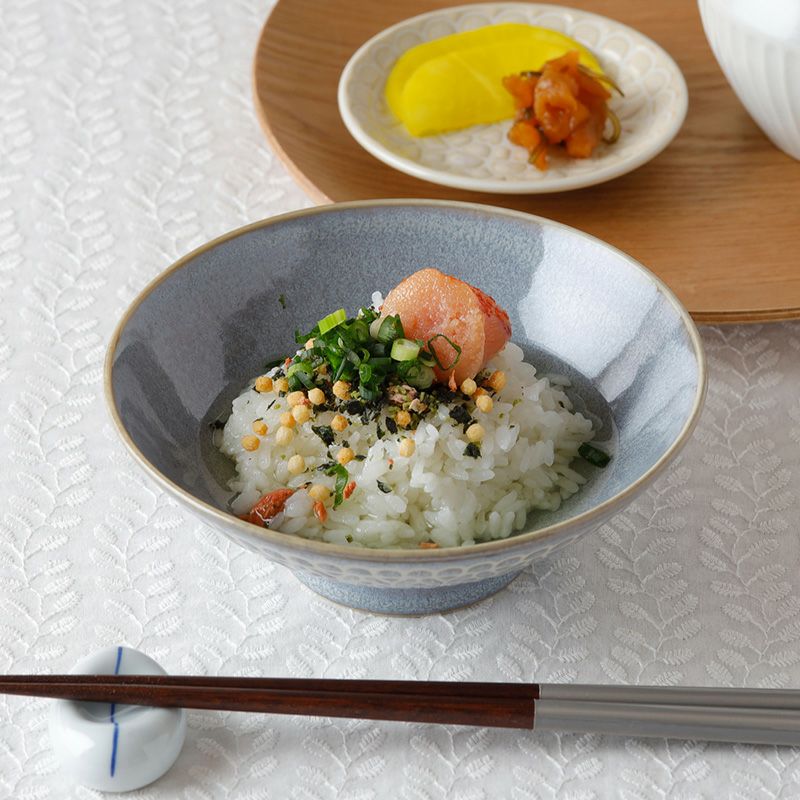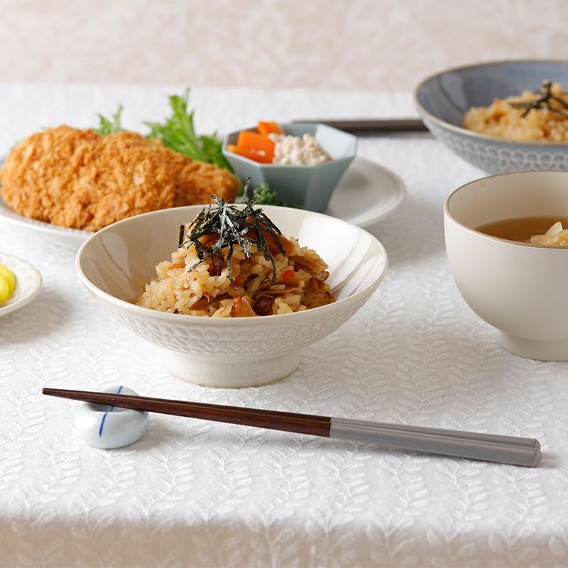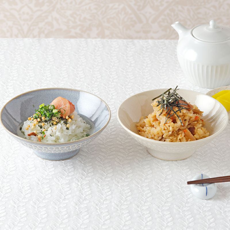 レース柄が上品でモダンな雰囲気のお茶碗。 カラーはホワイトとグレー。コーディネートしやすい上品で優しい色合いです。 洋食にもしっくり馴染んでくれるので、ご飯茶碗以外にもサラダボウル、スープボウルにもおすすめ。