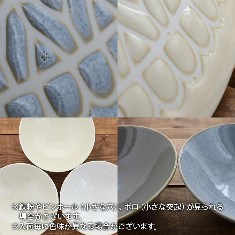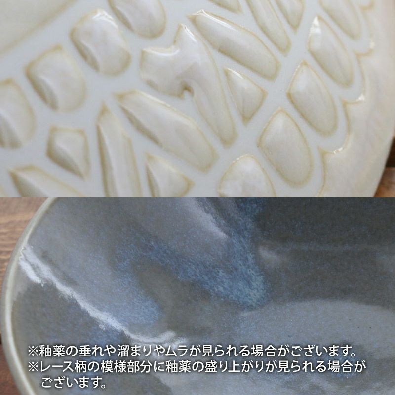 | 注意事項 | ※サイズは全て外寸になります。 ※サイズ・重さなどは商品により誤差があります。 ※鉄粉やピンホール(小さな穴)、ボロ(小さな突起)が見られる場合がございます。 ※釉薬の垂れや溜まりやムラが見られる場合がございます。 ※入荷毎に色味が異なる場合がございます。 ※レース柄の模様部分に釉薬の盛り上がりが見られる場合がございます。 ※お客様のお使いのモニター設定、お部屋の照明等により実際の商品と色味が異なって見える場合がございます。 ※画像に含まれる小物は使用イメージのために使用しています。 ※不明な点がございましたら、お気軽にお問い合わせ下さい。 |