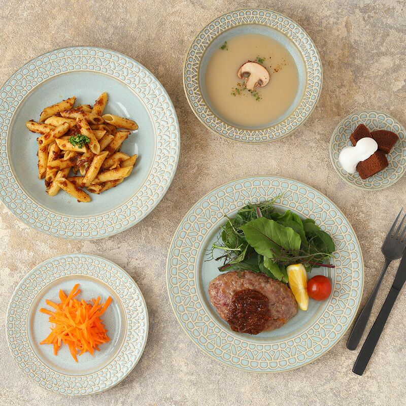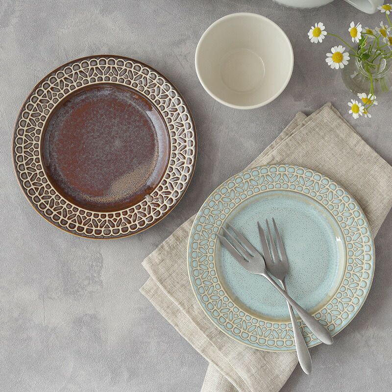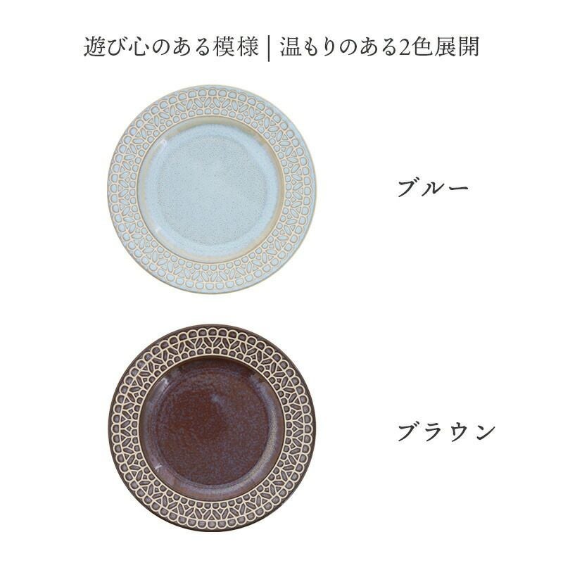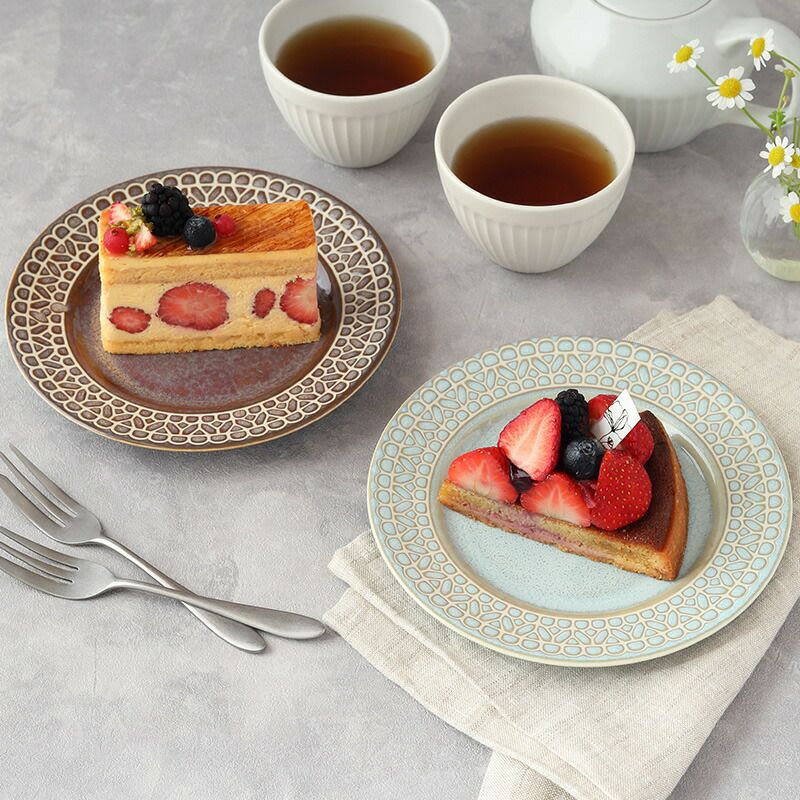 リム部分にほどこされた、レース柄がとてもきれいなプレート。 ティータイムのケーキ皿、朝食のパン皿、ランチやディナーのサラダ皿、前菜皿、取り皿におすすめ。 ほどよいサイズで様々なシーンで活躍してくれます。 レース模様が盛りつけた料理を上品で華やかに演出してくれる、おもてなしにもぴったりのプレートです。