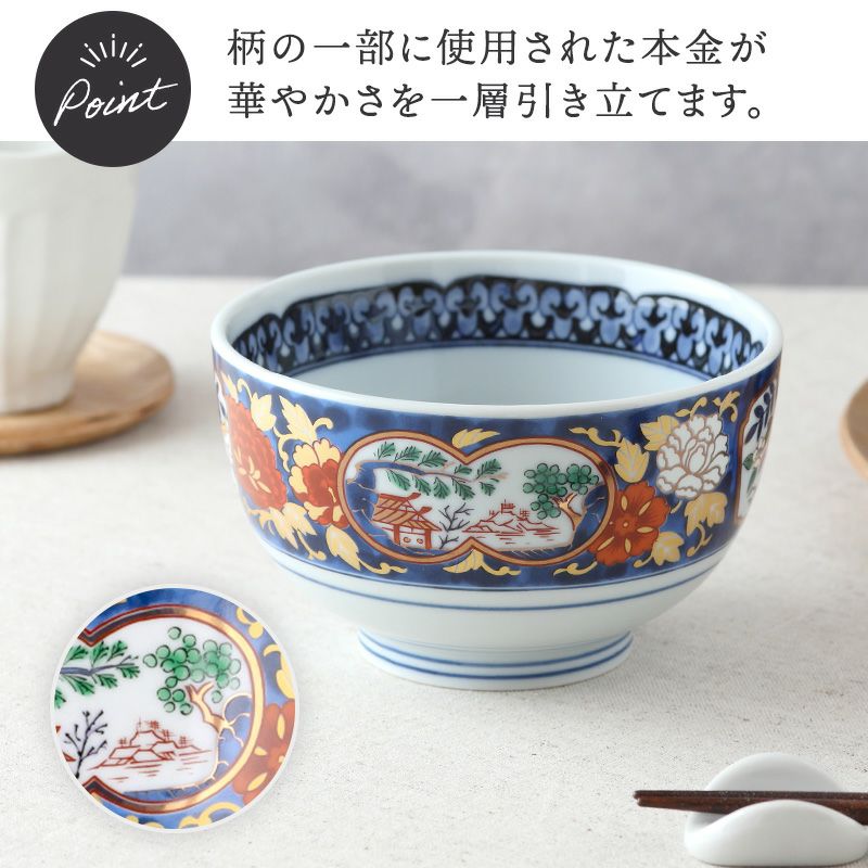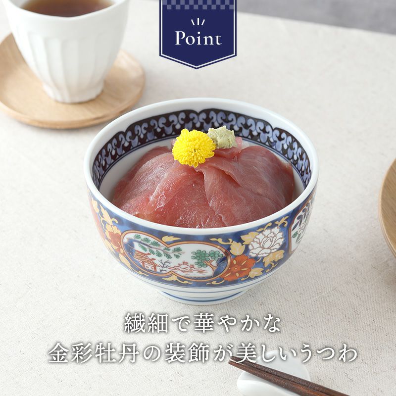 繊細で華やかな金彩牡丹の装飾が施されたどんぶり。 ご家庭の定番メニューである、ラーメン鉢やうどん丼ぶりなど、麺鉢に使えるどんぶり。 もちろん、海鮮丼など丼物メニューにも使えます。 上品な印象を与えてくれるこちらのうつわは、ちょっとしたお祝いの席にもおすすめです。