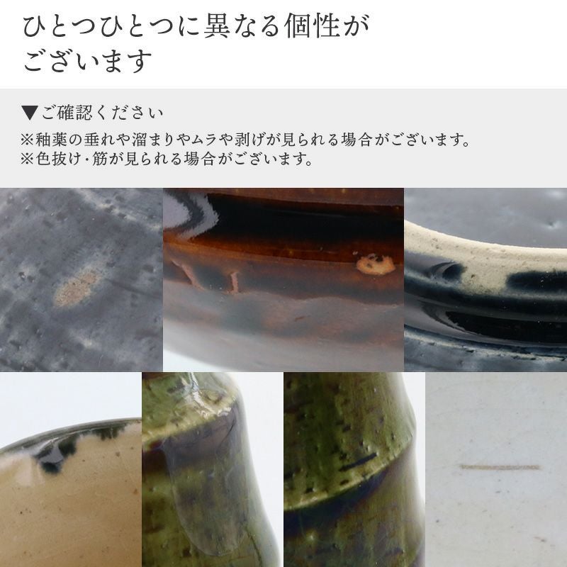 | 注意事項 | ※サイズは全て外寸になります。 ※サイズ・重さなどは商品により誤差があります。 ※鉄粉や小さな穴、小さな突起が見られる場合がございます。 ※釉薬の垂れや溜まりやムラや剥げの他、土の特性により凹凸、しわが見られる場合がございます。 ※ヒビを装飾に用いた「貫入」が表面に入っております。焼成で質感・色味に個体差が見られる場合がございます。 ※色抜け・筋が見られる場合がございます。 ※様々な症状は手造りにみられる「味」としてお楽しみ頂ければと思いますのでご了承下さい。 ※お客様のお使いのモニター設定、お部屋の照明等により実際の商品と色味が異なって見える場合がございます。 ※画像に含まれる小物は使用イメージのために使用しています。 ※不明な点がございましたら、お気軽にお問い合わせ下さい。 |