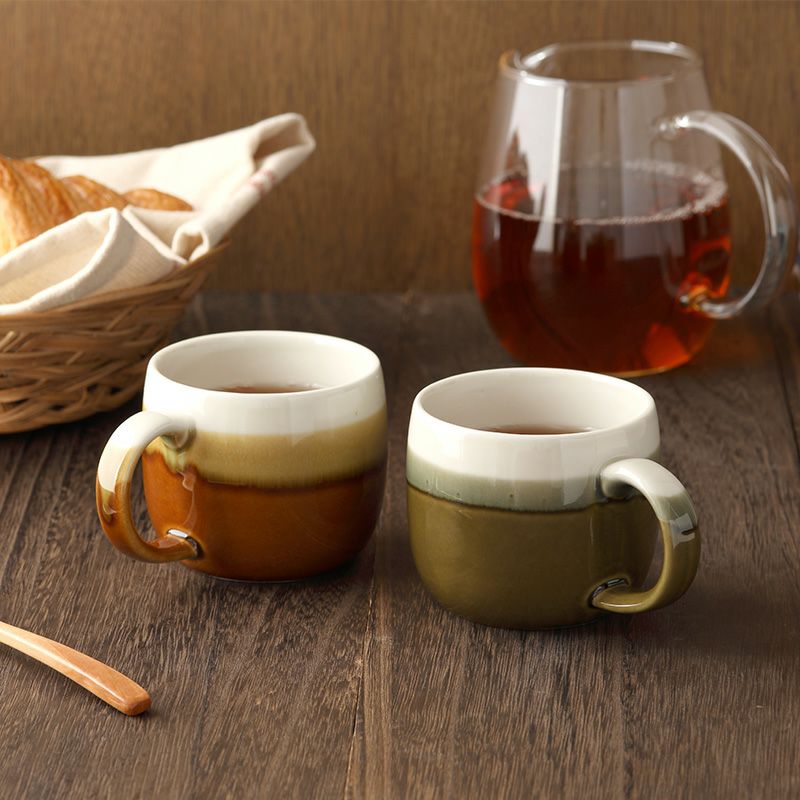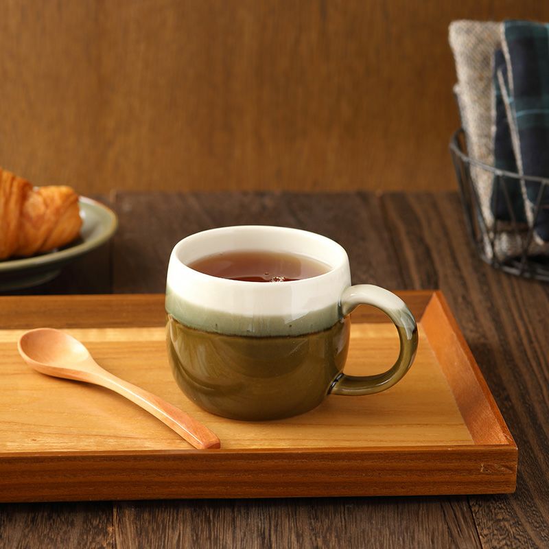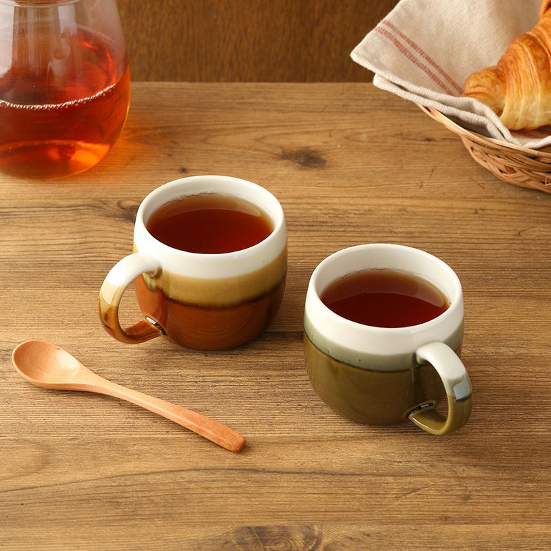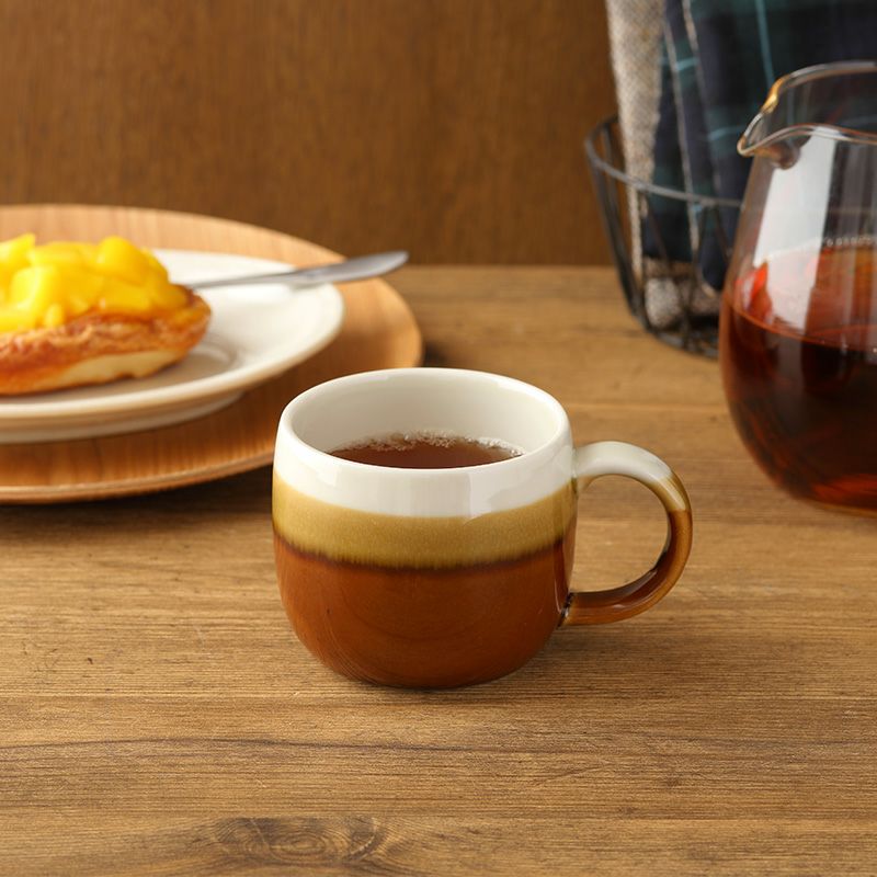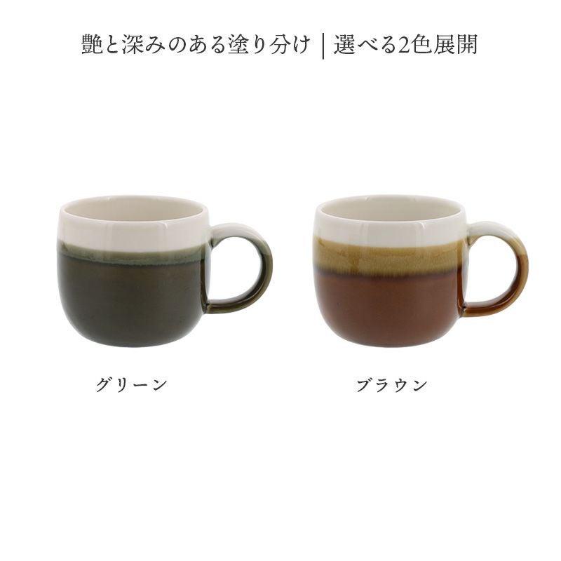 シックな和カラーが味わい深いマグカップ。 深みのあるカラーに爽やかなホワイトの塗り分けがアクセントになっています。 モダンなデザインで和食器・洋食器どちらにも合わせやすく、おしゃれな和カフェ風コーディネートにぴったり。 朝食、ティータイム、食後のコーヒー、紅茶など普段使いのカップとしてはもちろん、おもてなし食器としてもおすすめです。