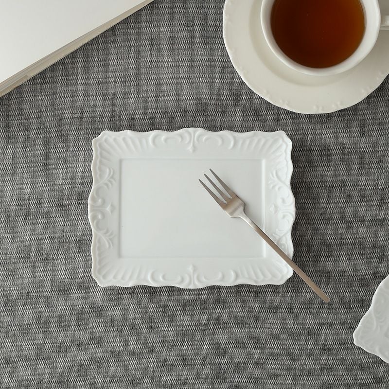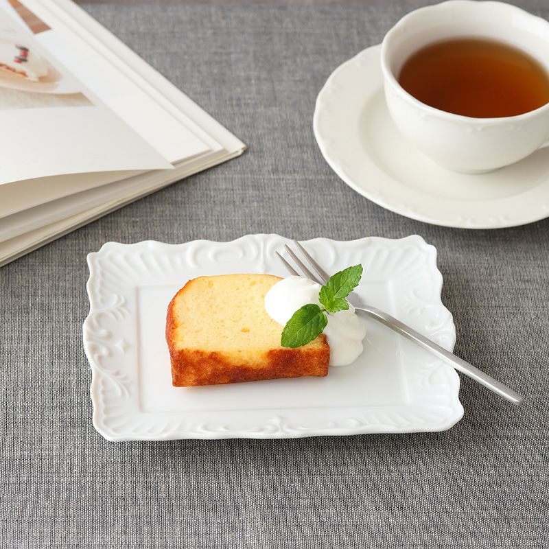 リム部分にアンティーク風のモチーフが入ったスクエアプレート。 上品なデザインの角皿で、シンプルな料理も華やかに演出してくれます。 こちらは中皿サイズでケーキ皿、サラダプレート、取り皿などにおすすめ。 おもてなし食器、普段使いにも使えるプレートです。