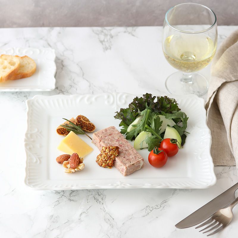 リム部分にアンティーク風のモチーフが入ったスクエアプレート。 上品なデザインの角皿で、シンプルな料理も華やかに演出してくれます。 こちらは副菜やデザートを並べて盛りつけたり焼物皿にもおすすめ。 おもてなし食器、普段使いにも使えるプレートです。