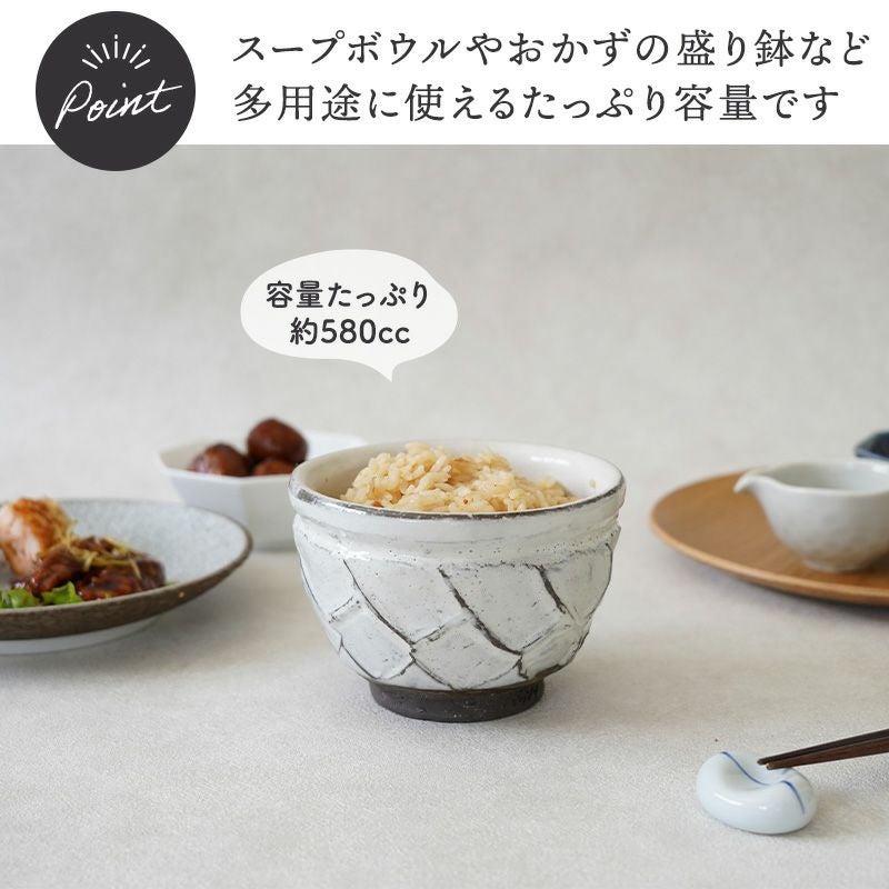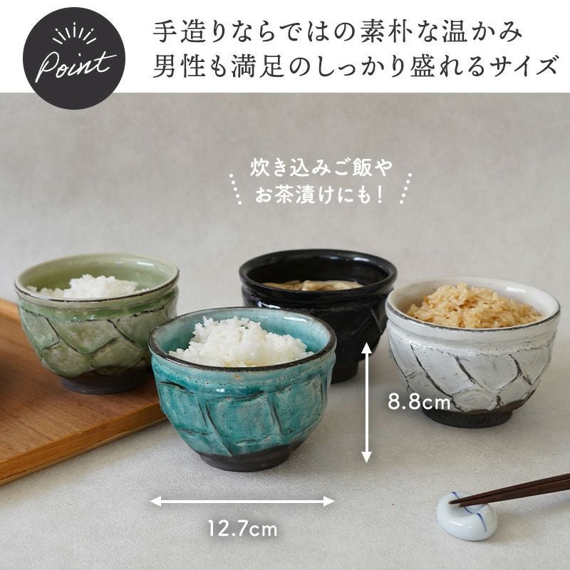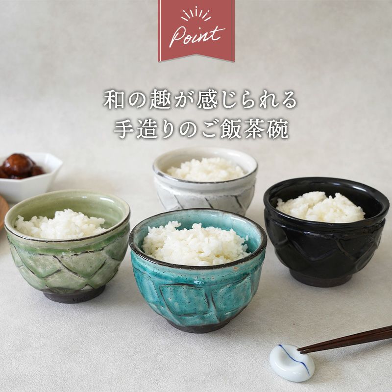 和の趣を楽しむことが出来る、貫入を施した手造りの茶碗です。 豊富な4色展開で、好みに合ったお色を選べるのも嬉しいポイント。 ご飯茶碗としてお米をしっかり盛れるだけでなく、スープボウルやおかずの盛り鉢、抹茶茶碗やデザートボウルなど多用途に使える便利な食器です。 味わいのある黒土の風合いと複雑な釉薬の色合いがマッチした、手造り感溢れる唯一無二の器です。