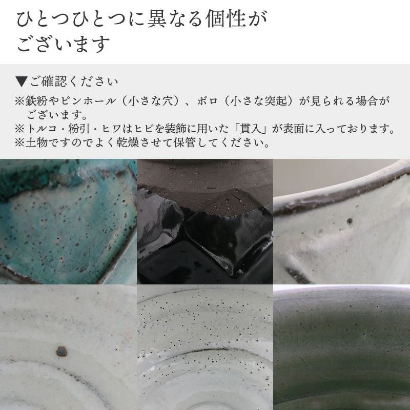 | 注意事項 | ※サイズは全て外寸になります。 ※サイズ・重さなどは商品により誤差があります。 ※鉄粉やピンホール(小さな穴)、ボロ(小さな突起)が見られる場合がございます。 ※トルコ・粉引・ヒワはヒビを装飾に用いた「貫入」が表面に入っております。 ※こちらの商品は手造りのため、一点一点の大きさや重さや釉薬の色味に多少の差異があります。手造りの特徴としてご理解をお願い致します。 ※土物ですのでよく乾燥させて保管してください。 ※お客様のお使いのモニター設定、お部屋の照明等により実際の商品と色味が異なって見える場合がございます。 ※画像に含まれる小物は使用イメージのために使用しています。 ※不明な点がございましたら、お気軽にお問い合わせ下さい。 |