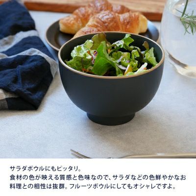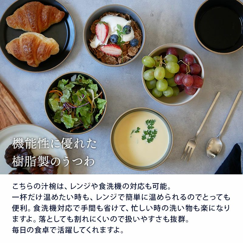 見た目もシンプルでおしゃれな汁椀は使い勝手の良い樹脂製で電子レンジ・食洗機対応。 忙しい時でも気軽に温めができ、片付けもらくちん。 モダンなデザインで和食、洋食、どちらにもしっくり馴染んでくれます。 汁椀以外にもお茶碗、中鉢、デザートボウル、フルーツボウルなどにおすすめ。
