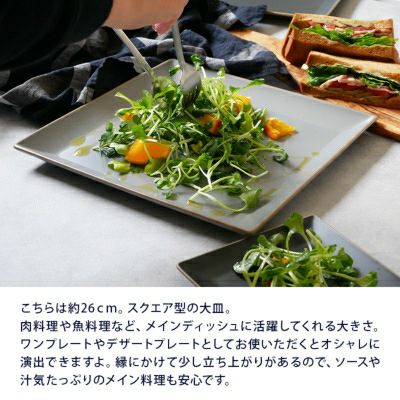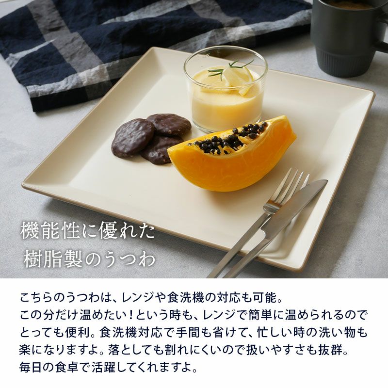 見た目もシンプルでおしゃれなプレートは使い勝手の良い樹脂製で電子レンジ・食洗機対応。 忙しい時でも気軽に温めができ、片付けもらくちん。 モダンなデザインで和食、洋食、どちらにもしっくり馴染んでくれます。 こちらは大皿サイズでパスタ皿、ワンプレート、ディナープレート、盛り皿などにおすすめ。