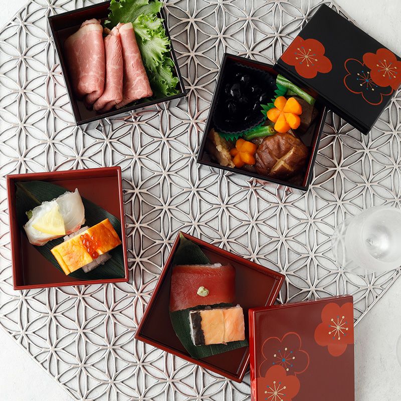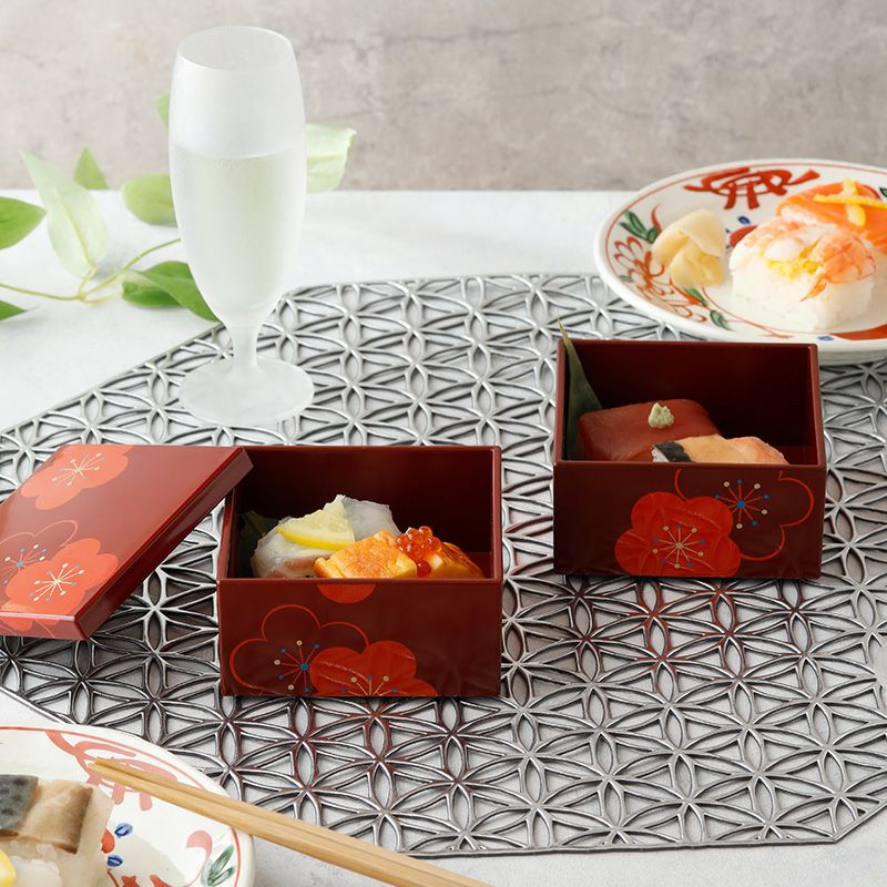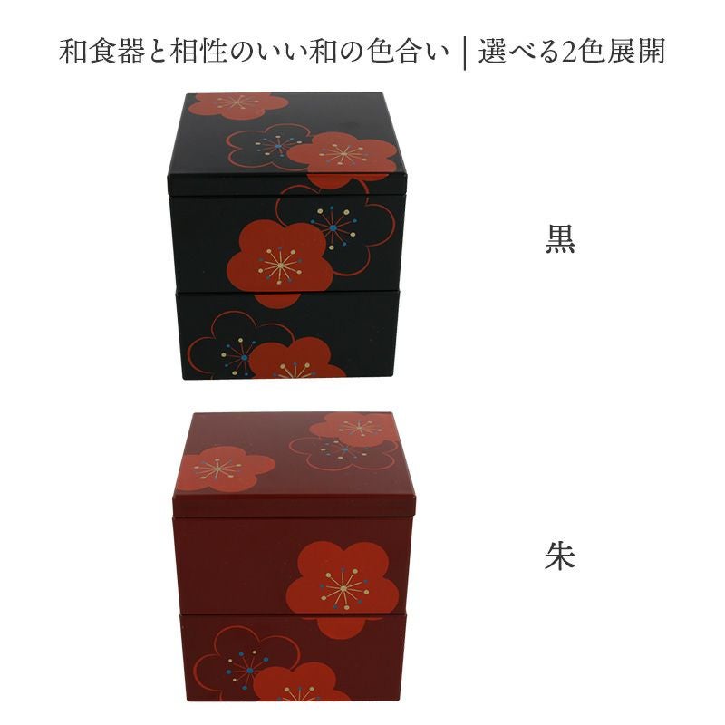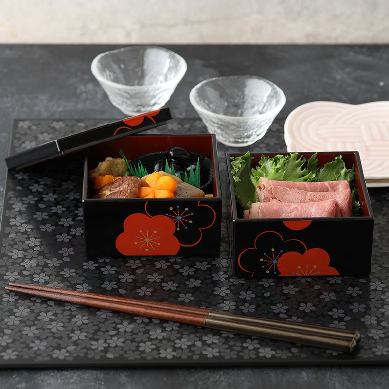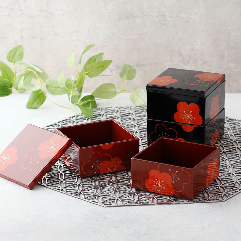 可愛らしい梅柄の重箱です。 運動会や行楽イベント、お正月のおせち料理にも。 こちらは二段重タイプ。 おにぎりやサンドイッチと一緒に、おかずもたっぷり入れられます。