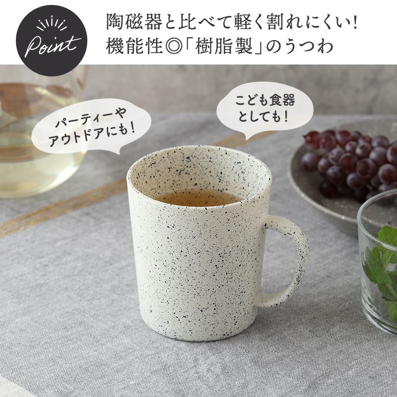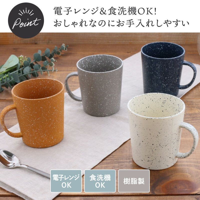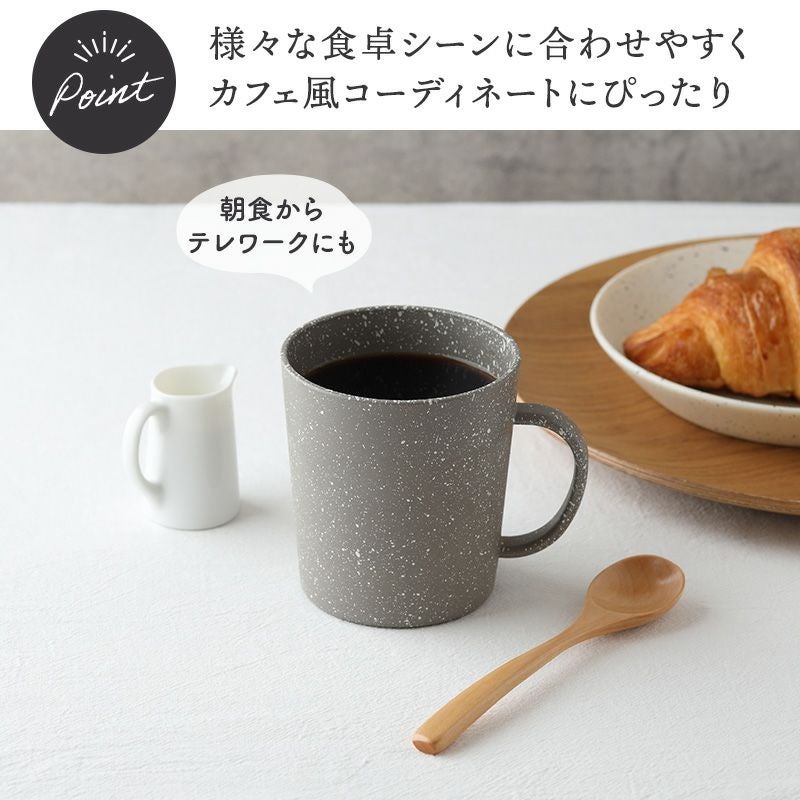 見た目もシンプルでおしゃれなマグカップは使い勝手の良い樹脂製で電子レンジ・食洗機対応。 コーヒーカップとしてはもちろん、カフェオレから紅茶、スープカップにも幅広くお使いいただけます。 忙しい時でも気軽に温めができ、片付けもらくちん。 様々な食卓シーンに合わせやすいカラーなので、ご家族分揃えたりカップルやご夫婦でペアでお使いいただくこともおすすめです。