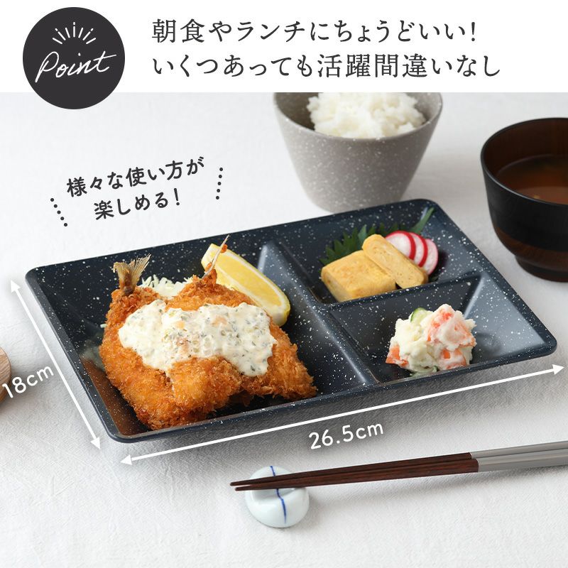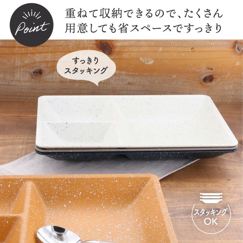 見た目もシンプルでおしゃれな仕切り皿は使い勝手の良い樹脂製で電子レンジ・食洗機対応。 和食洋食問わず主食と副菜、メインディッシュをバランスよく盛り付けることが出来ます。 忙しい時でも気軽に温めができ、片付けもらくちん。 様々な食卓シーンに合わせやすいカラーなので、ご家族分揃えたりカップルやご夫婦でペアでお使いいただくこともおすすめです。