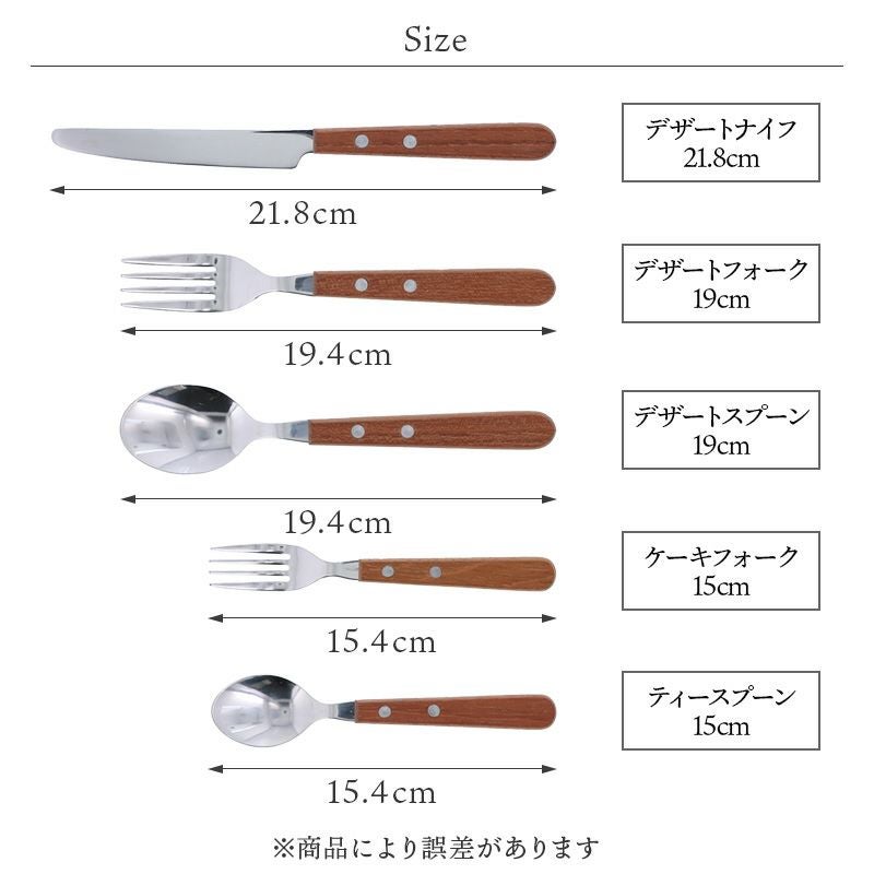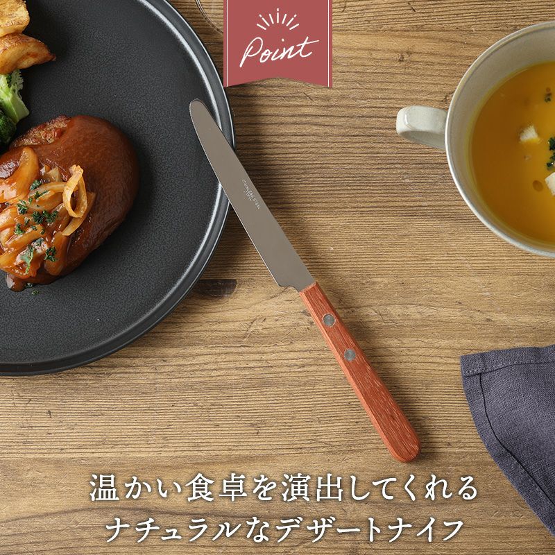 持ち手部分が木製のナチュラルなデザートナイフ。 木製カトラリーの優しい風合いは、おうちカフェにもぴったり。 こちらは天然木を使用しており、木目や色合いなど、一つひとつ違った表情を楽しむことができますよ。 すっきりとしたデザインは普段使いからおもてなしにも活用でき、デザートをはじめ、オードブル、メイン料理まで幅広くお使いいただけます。