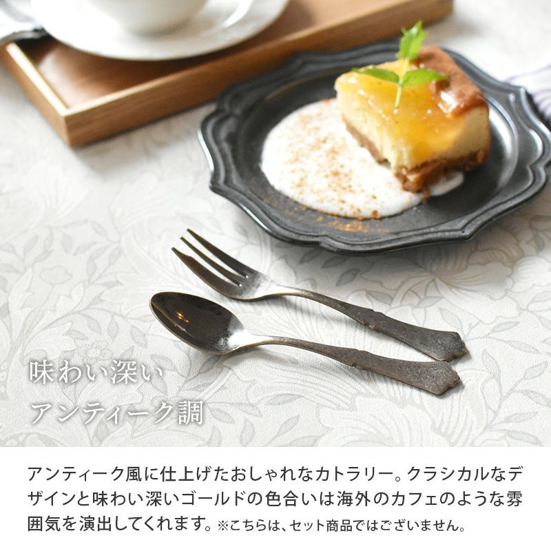 アンティーク風に仕上げたおしゃれなカトラリー。 クラシカルなデザインと味わい深いゴールドの色合いは海外のカフェのような雰囲気を演出してくれます。 小さめカトラリーはデザートやサラダやスープになど幅広い用途に使え、複数揃えておくと重宝しますよ。 こども用カトラリーとしてもおすすめ。