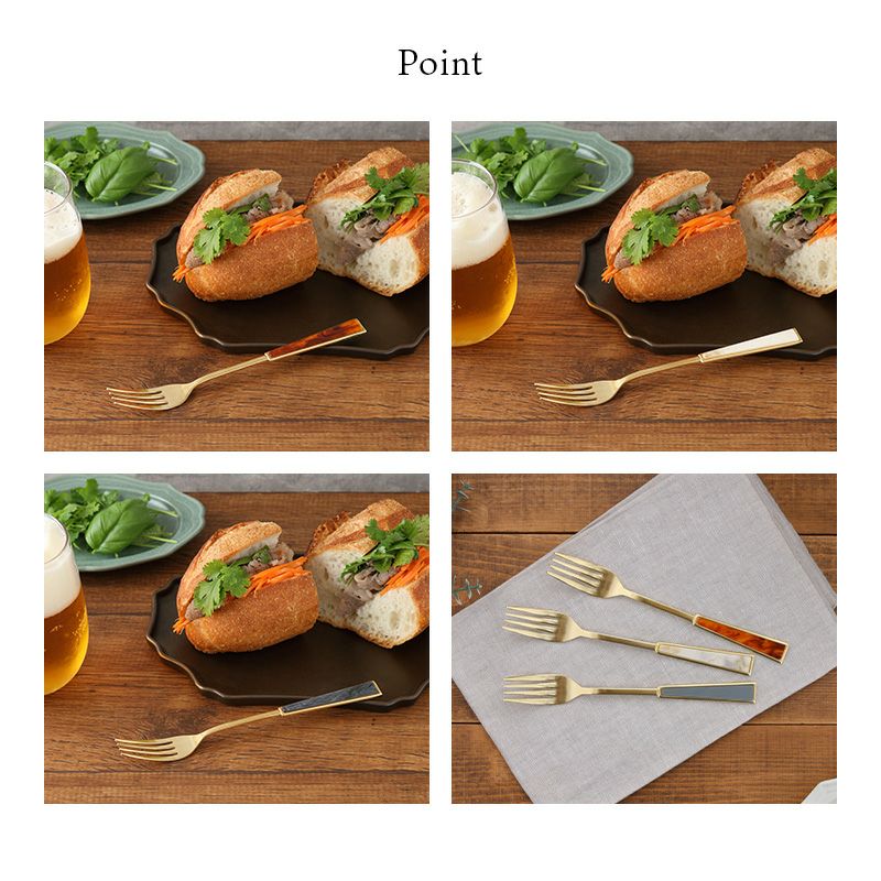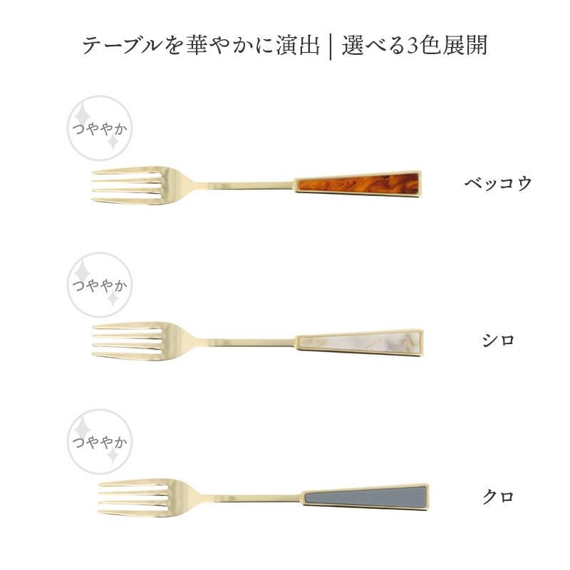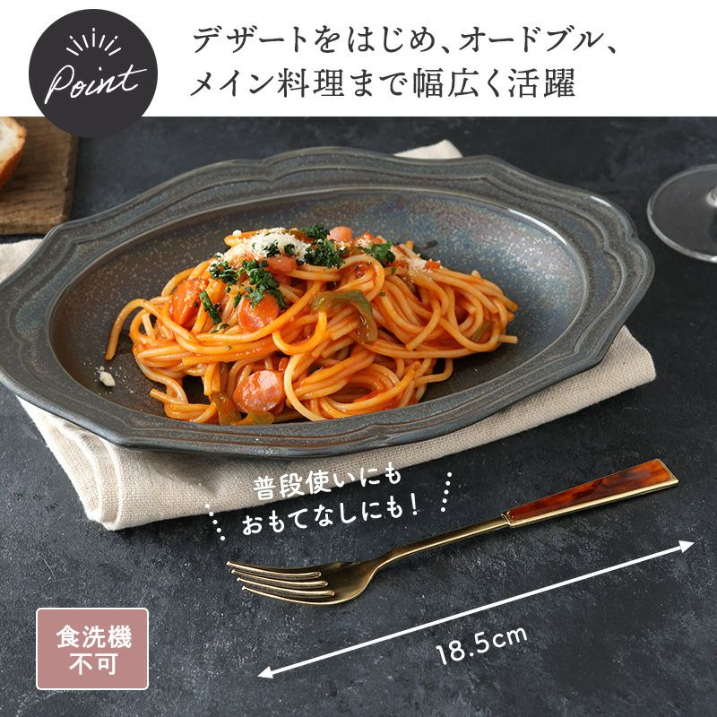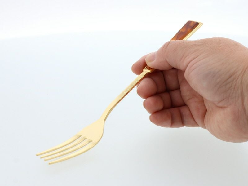 日本製の高品質なカトラリー・デザートフォークです。 美しく、品のあるゴールドのカラーと持ち手部分のレトロなデザインが、テーブルを華やかに演出します。 また、カラーはべっ甲、黒、白の3色展開で、様々なテーブルシーンに合わせてお選びいただけます。 こちらは18.5cmのフォーク、デザート・ケーキ用をはじめパスタフォークなど洋食のカトラリーとしてもおすすめです。
