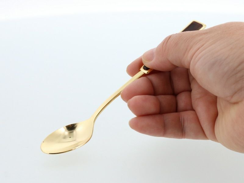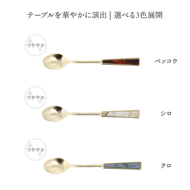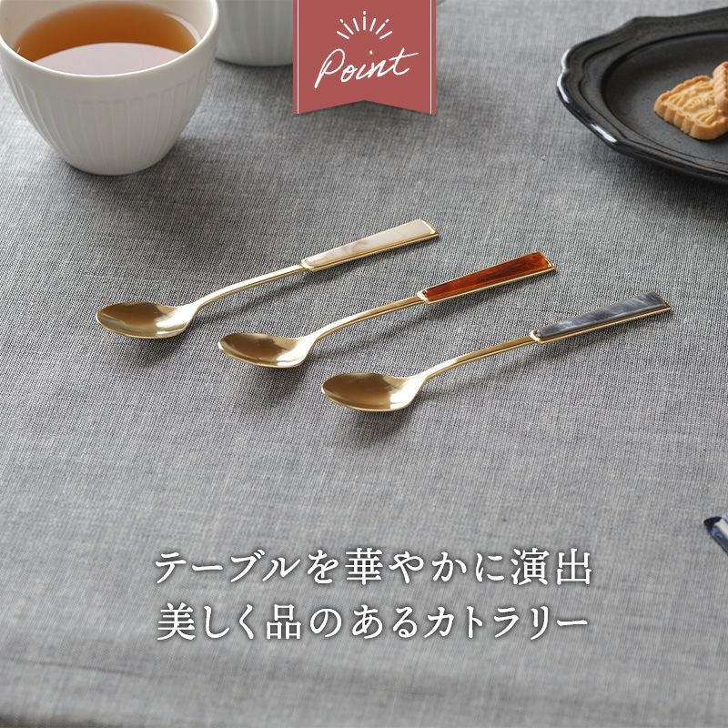 日本製の高品質なカトラリー・ティースプーンです。 美しく、品のあるゴールドのカラーと持ち手部分のレトロなデザインが、テーブルを華やかに演出します。 また、カラーはべっ甲、黒、白の3色展開で、様々なテーブルシーンに合わせてお選びいただけます。 こちらは14cmの小さめのスプーン。コーヒー・紅茶用のスプーンをはじめ、デザート・ヨーグルト・子供用カトラリーとしてもおすすめ。