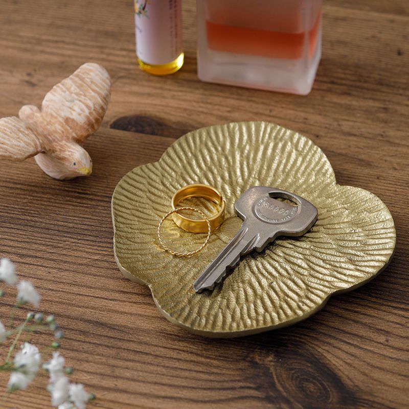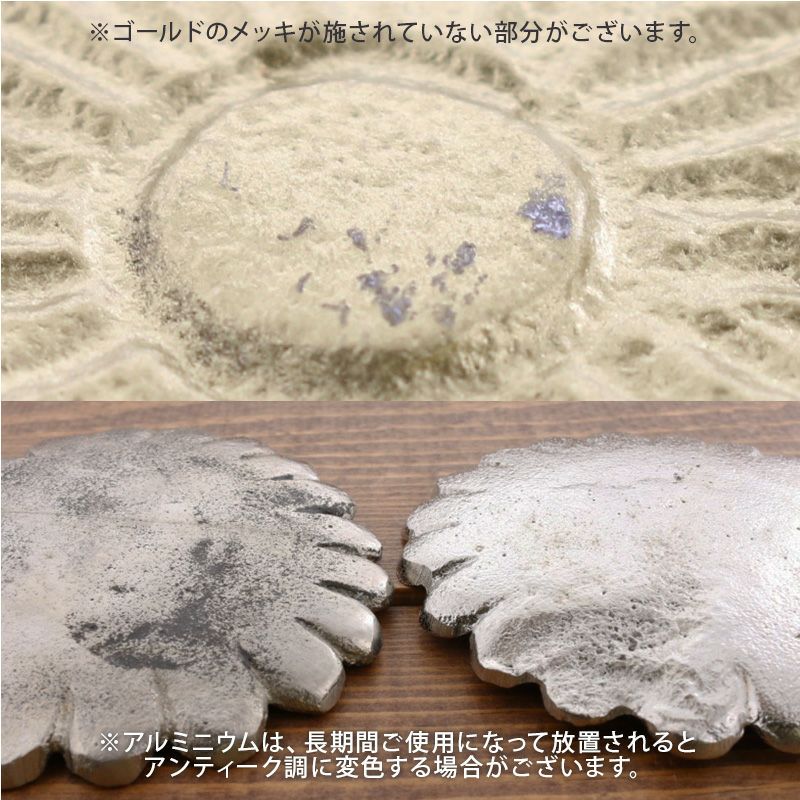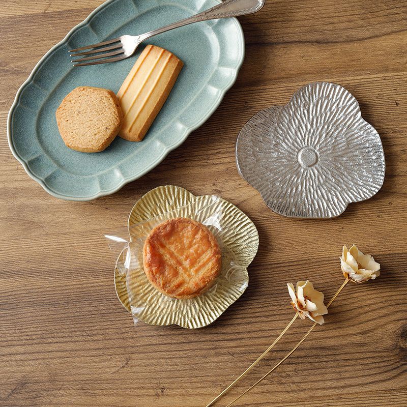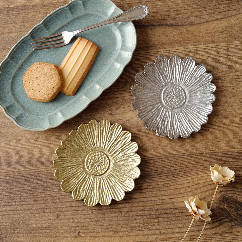 花型のアルミ製小皿。重厚感もありアンティークな雰囲気で、食卓やインテリアのアクセントになります。 コースターとして、アクセサリートレイなどにぴったり。 華やかに演出したいおもてなしアイテムとしてもおすすめです。