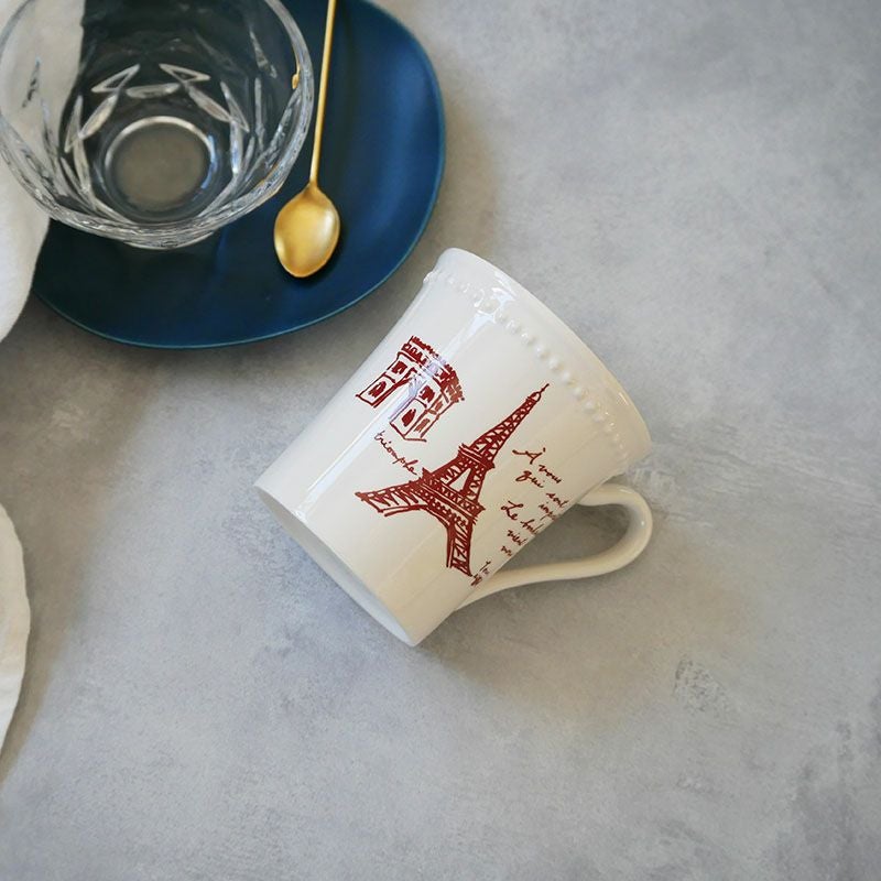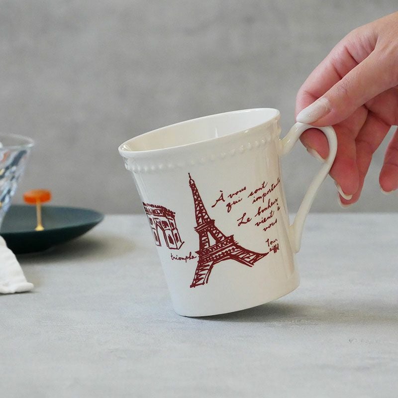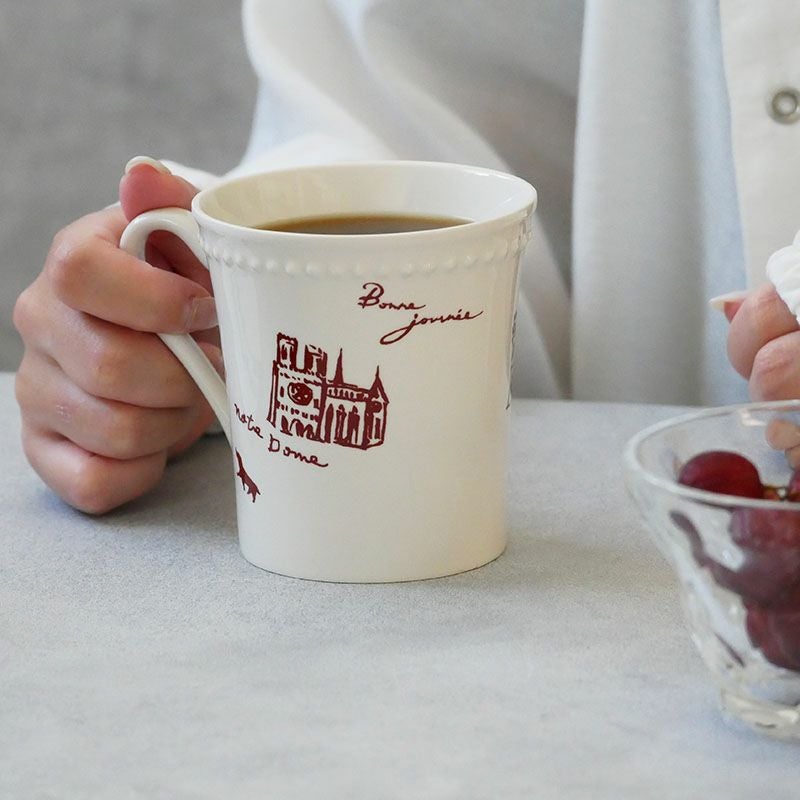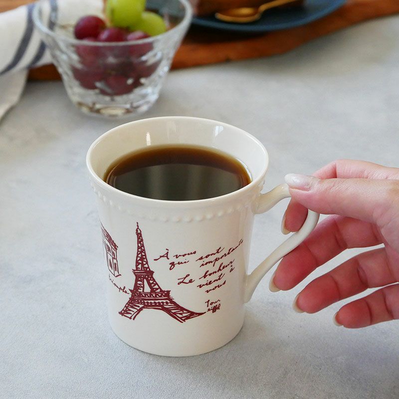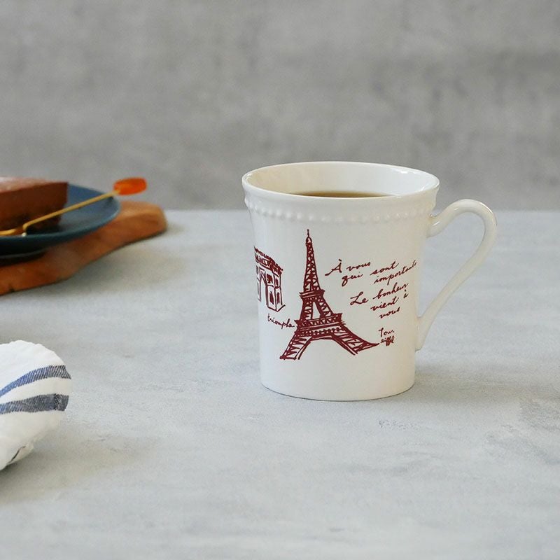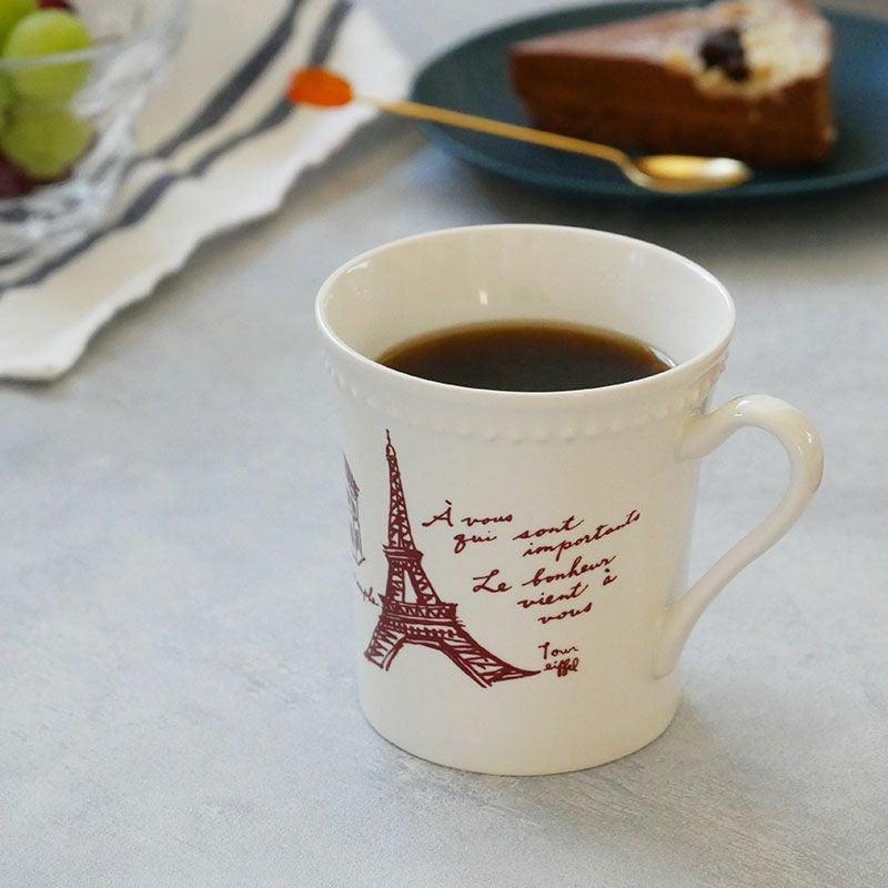 パリのシンボルが描かれたかわいいマグカップです。 ティータイムのティーカップやコーヒーカップとして丁度いいサイズ。 もちろん毎日飲むお水や麦茶のカップとしても。 普段使いから来客時のおもてなし食器としてご使用いただけるマグカップです。