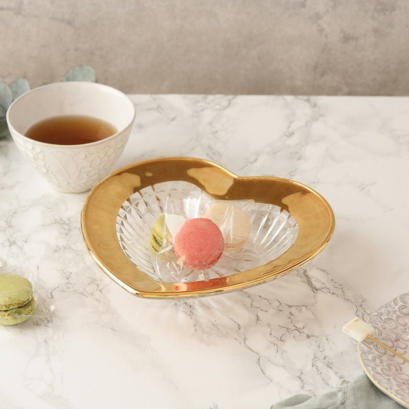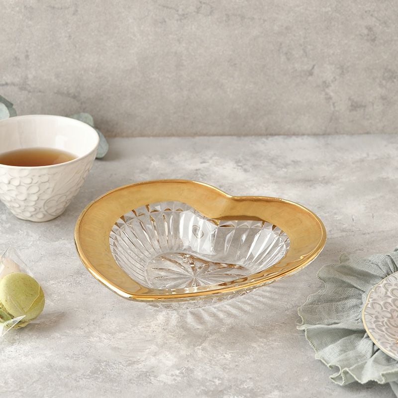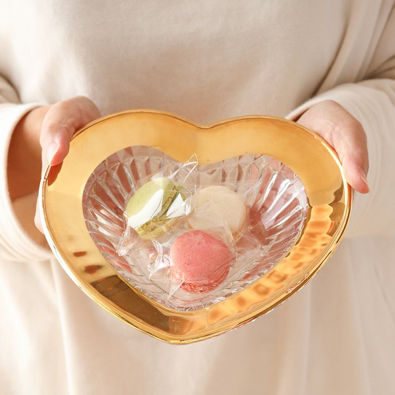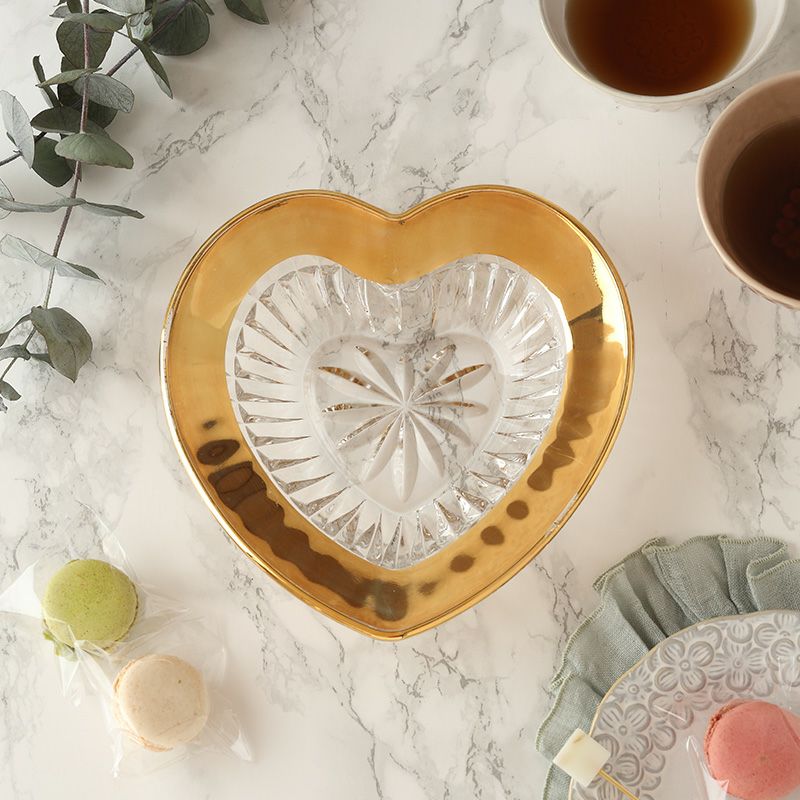 ハート型のゴールドの装飾が施されたガラスボウルは、高級感を演出しながらも可愛らしさを添えてくれます。 こちらは19.5cmの中鉢サイズでお菓子などの盛り付け・小物入れにぴったり。 普段の食卓をはじめ、パーティーやおもてなしのテーブルに華やかさをプラスしてくれます。