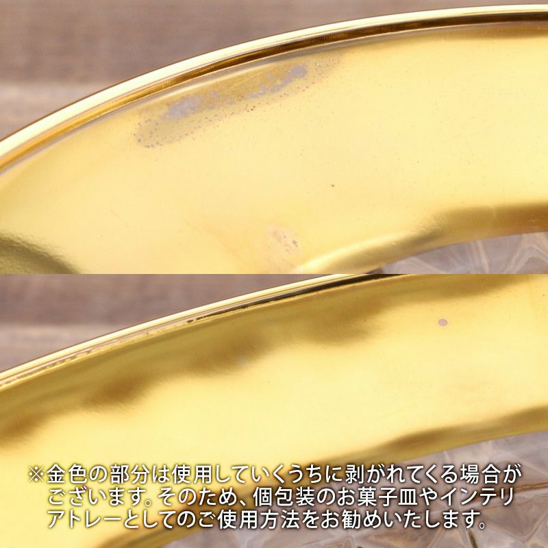 ※サイズは全て外寸になります。 ご注意 ※金色の部分は使用していくうちに剥がれてくる場合がございます。個包装のお菓子皿やインテリアトレーとしてのご使用をお勧めいたします。 ※アウトレット商品のため金色の部分に傷やハゲがある場合がございます。こちらの症状でのご返品はお受けできませんので予めご了承ください。 ※金色の部分が目の粗いスポンジなどで強く擦ると剥がれる場合がございます。柔らかい布やスポンジで洗ってください。 ※お客様のお使いのモニター設定、照明等により実際の商品と色味が異なって見える場合がございます。 ※画像に含まれる小物は使用イメージのために使用しています。 |