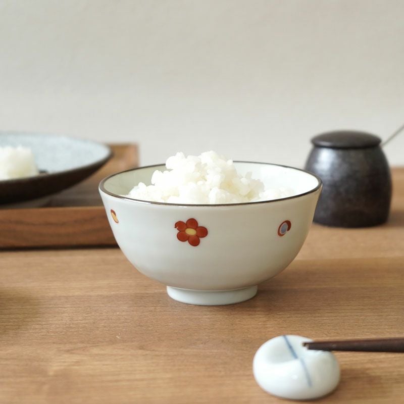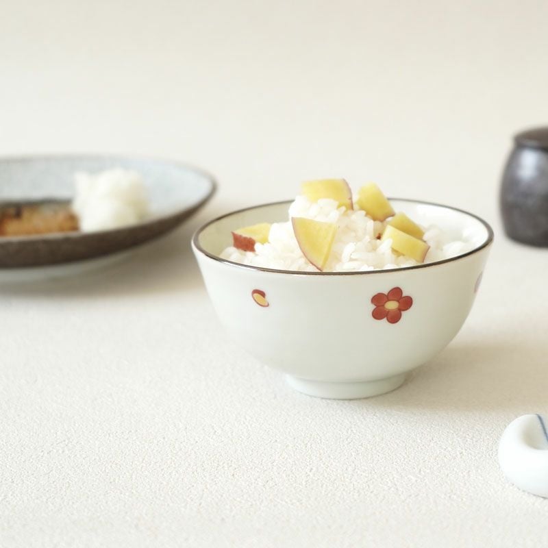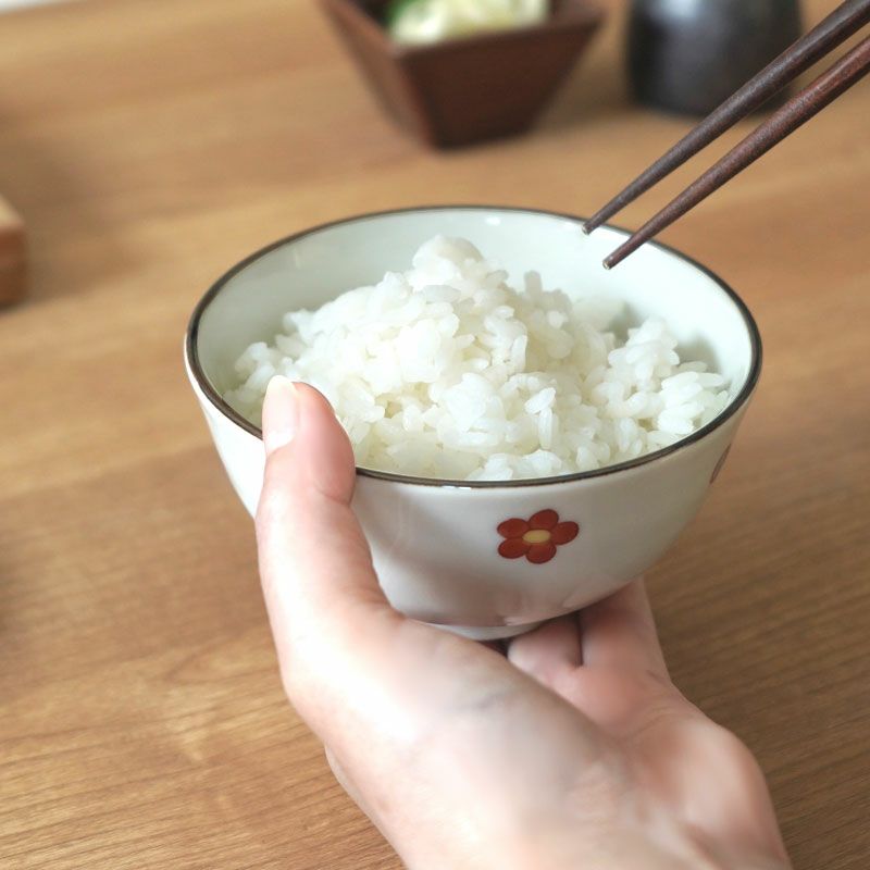 ほっこり和む、小花模様のお茶碗。 小ぶりなお茶碗ですので、女性用やお子さま用におすすめです。 丸型の形状の飯碗は手にとても良く馴染むため、お年寄りにはもちろんどなたでも持ちやすく使いやすいですよ。 ご飯の美味しさを引き立て、食事の時間をより楽しく演出します。