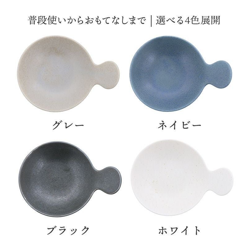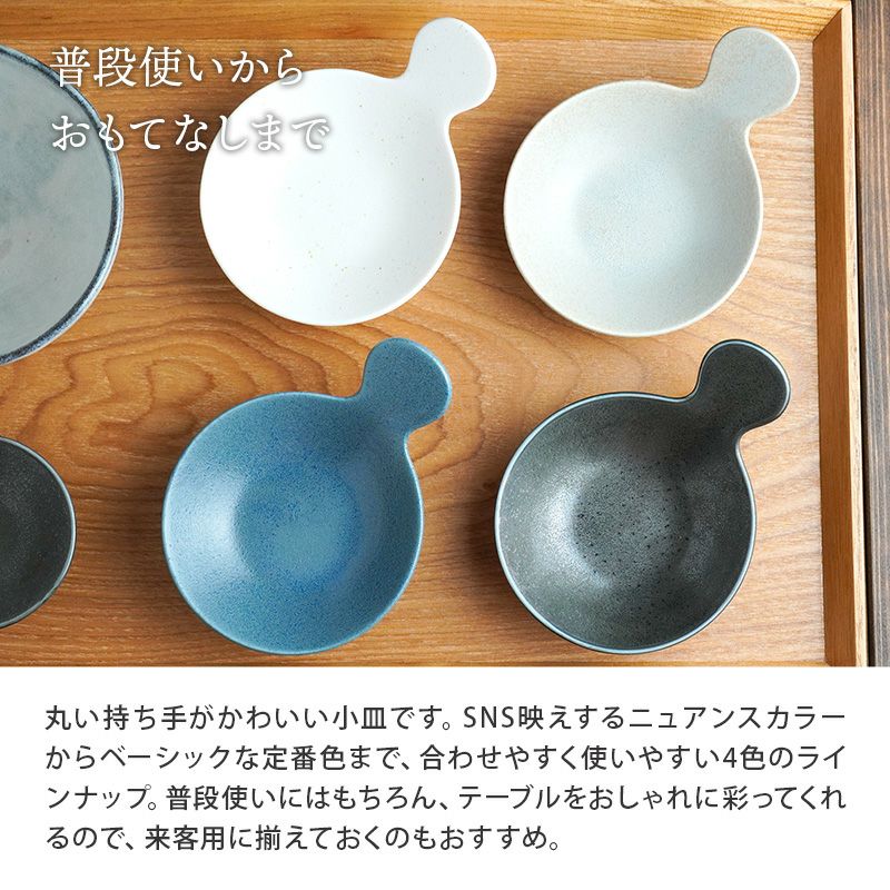 丸い持ち手がかわいい小皿です。 おかずをちょこっとよそって和カフェ風にトレイに並べてみたり、前菜皿、フルーツ皿、菓子皿にも最適。 持ち手部分に手をそっと添えることができることで、安定感があり、たれ皿、醤油皿にもおすすめですよ。 おもてなし食器としてもおしゃれにテーブルを彩ってくれます。