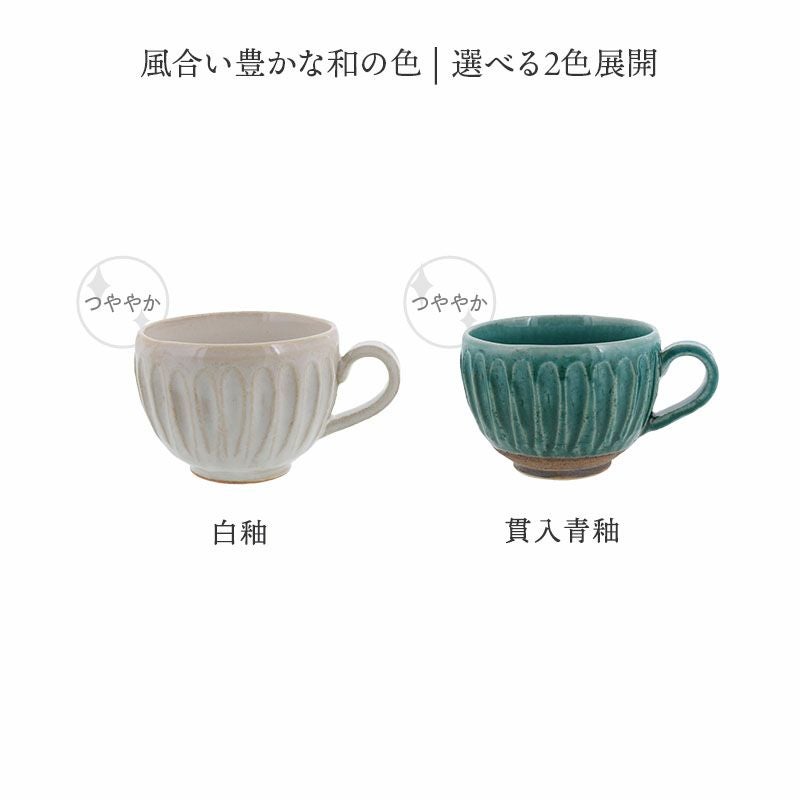 温かみのある質感と味わい深いカラーでほっこり癒される、取っ手付きのスープカップ。 溝の部分に流れ込んだ釉薬が独特の表情をつくり、落ち着いた和の雰囲気を楽しませてくれます。 こちらのスープカップは、スープ以外にもサラダボウル、デザートやアイスなどにも使えます。もちろん、コーヒー・カフェオレなどホットドリンクにも最適。 和風なのに洋食器とも合わせやすく、和洋中と豊かな現代の食卓にマッチする器は、普段使いにはもちろん、おもてなし食器としてもおすすめです。